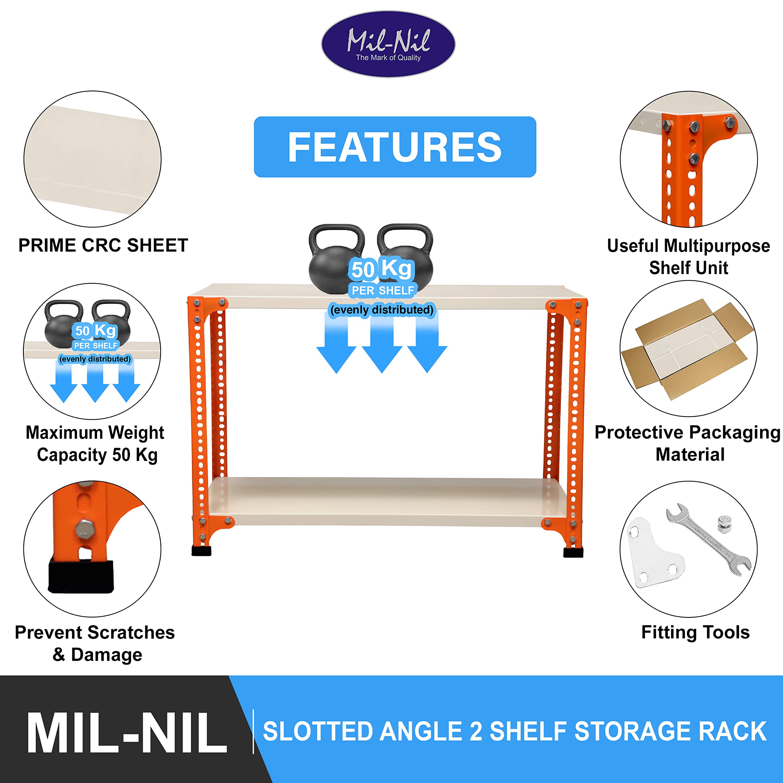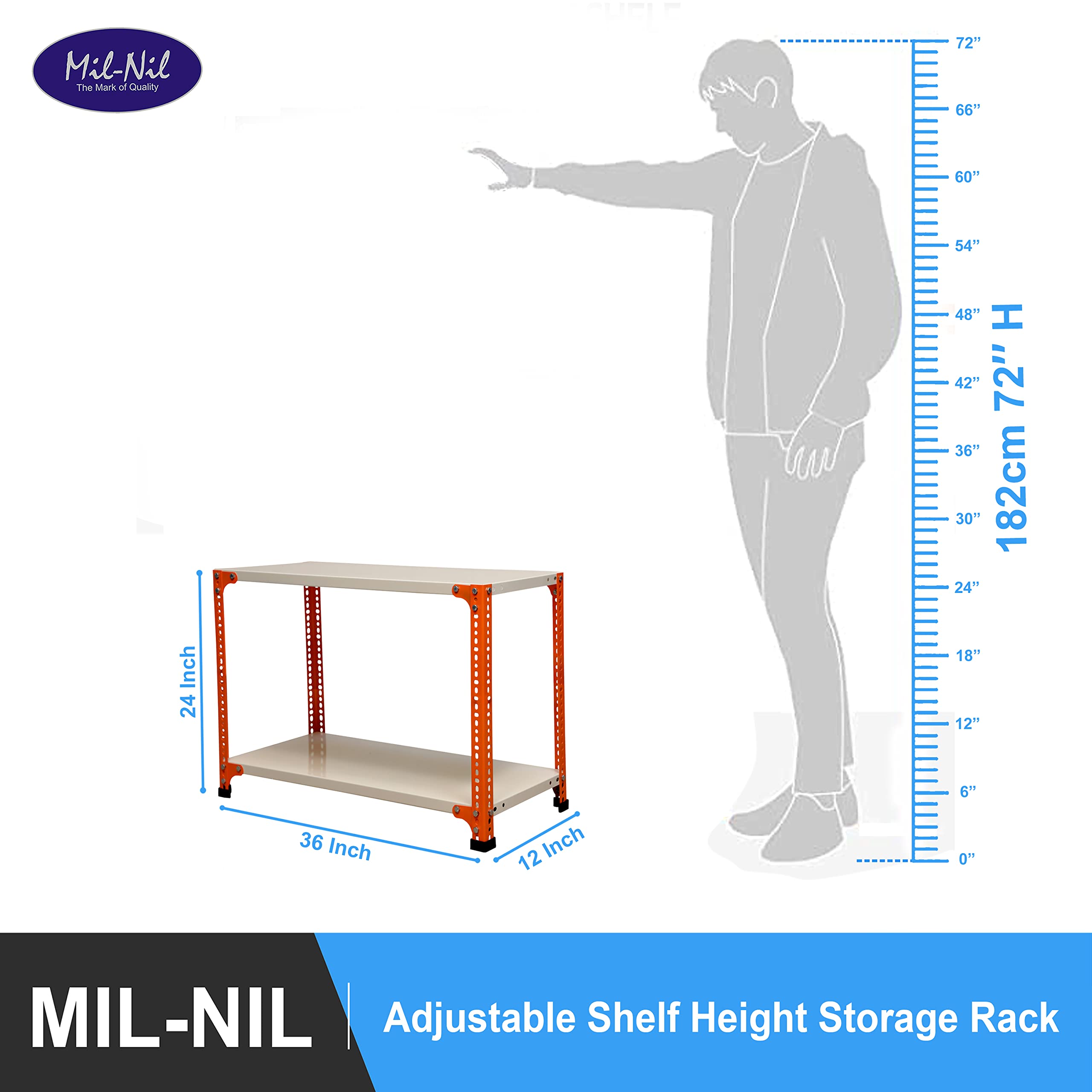 Item NameMil-Nil Prime CRC Sheet 2 Shelf 22 Gauge Multipurpose Slotted Angle Rack | Adjustable Shelf Hight Powder Coated Rack for Home & Kitchen (24x36x12 Inch, 7 Kg, Orange/Ivory) 16 Gauge Angles