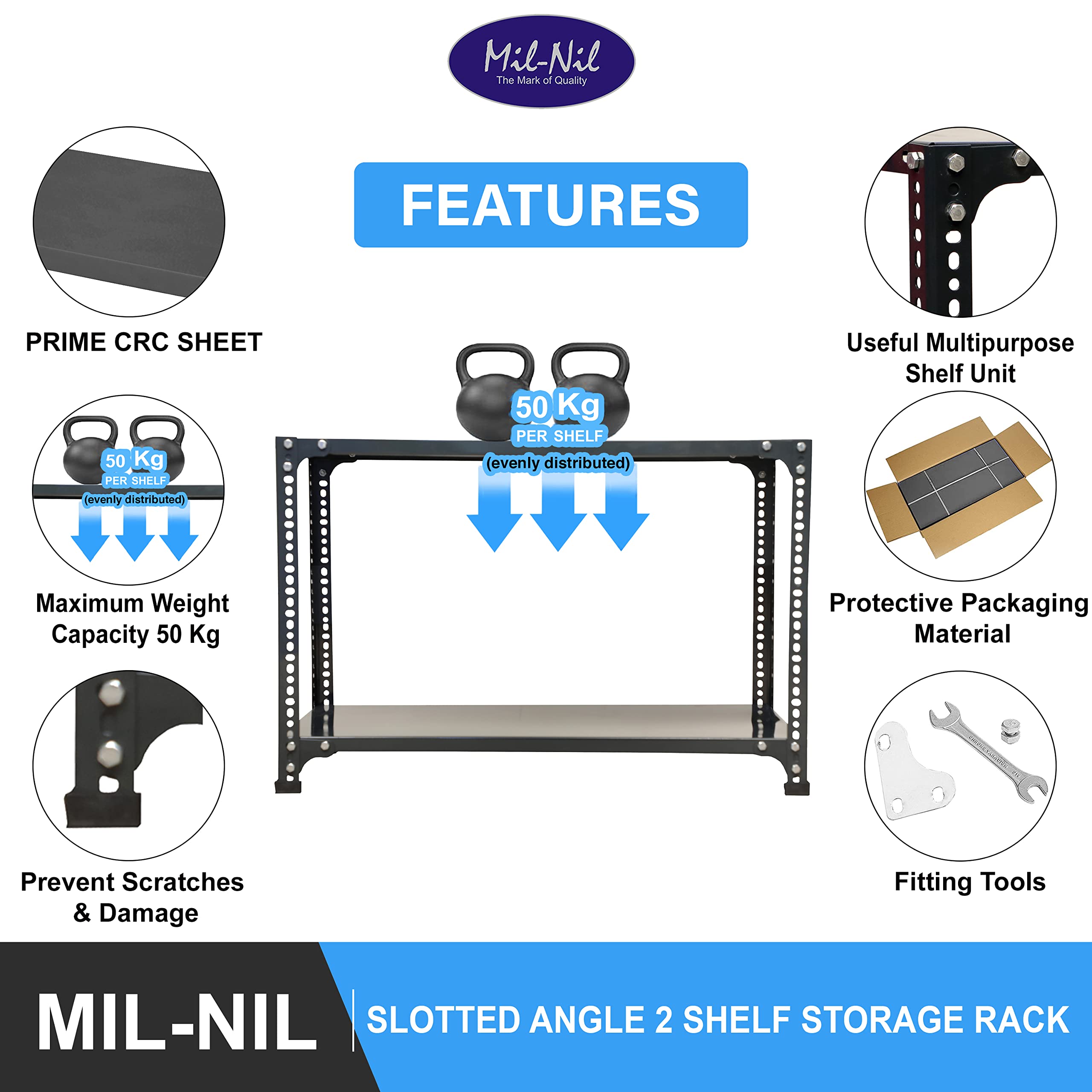 Mil-Nil Prime CRC Sheet 2 Shelf 22 Gauge Multipurpose Slotted Angle Rack | Adjustable Shelf Hight Rack for Home & Kitchen (24x36x12 Inch, 7 Kg, Grey) 16 Gauge Angles