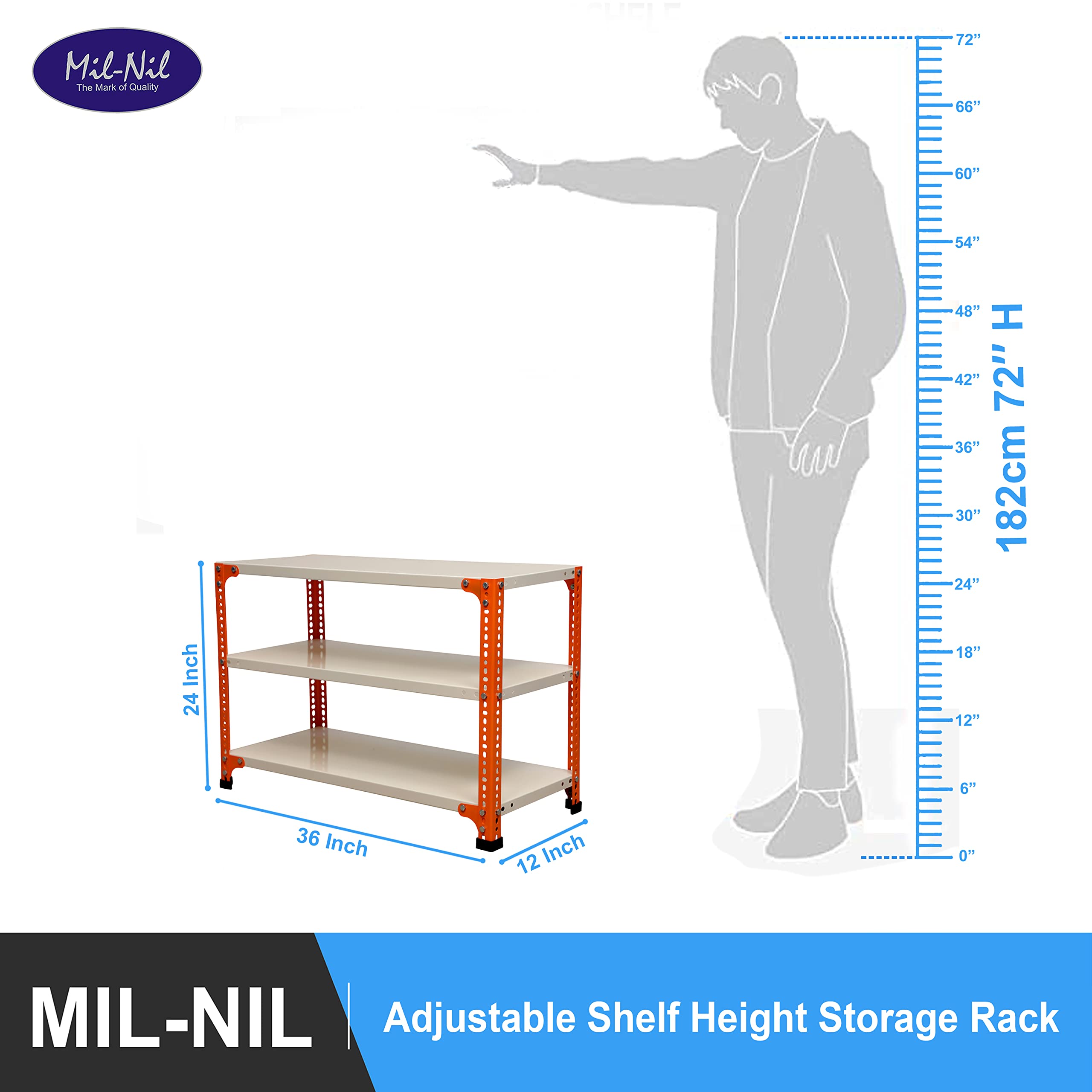 Item NameMil-Nil Prime CRC Sheet 3 Shelf 22 Gauge Multipurpose Slotted Angle Rack | Adjustable Shelf Hight Powder Coated Rack for Home & Kitchen (24x36x12 Inch, 9 Kg, Orange/Ivory) 16 Gauge Angles