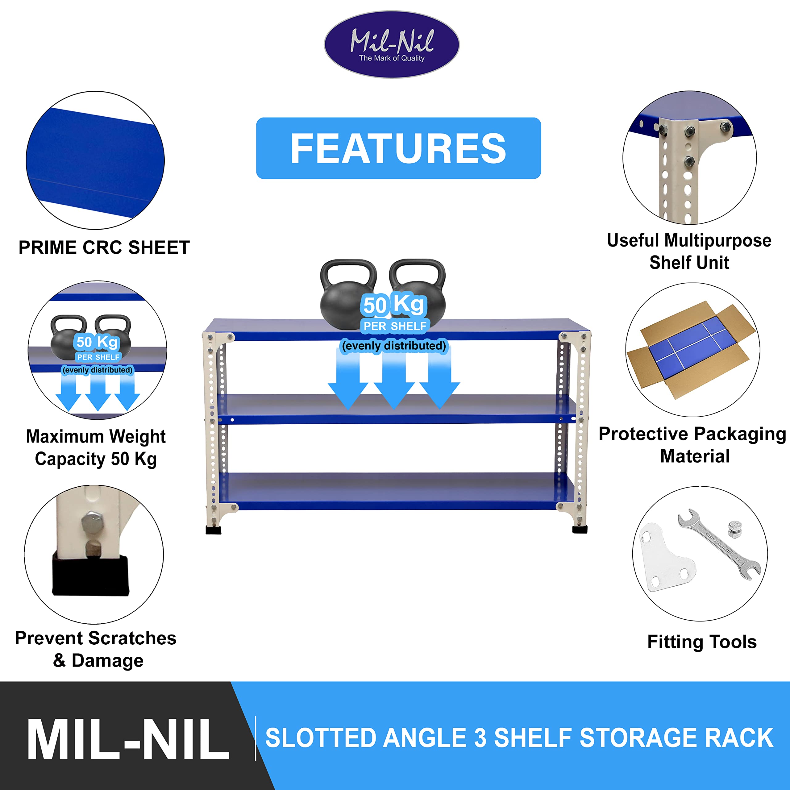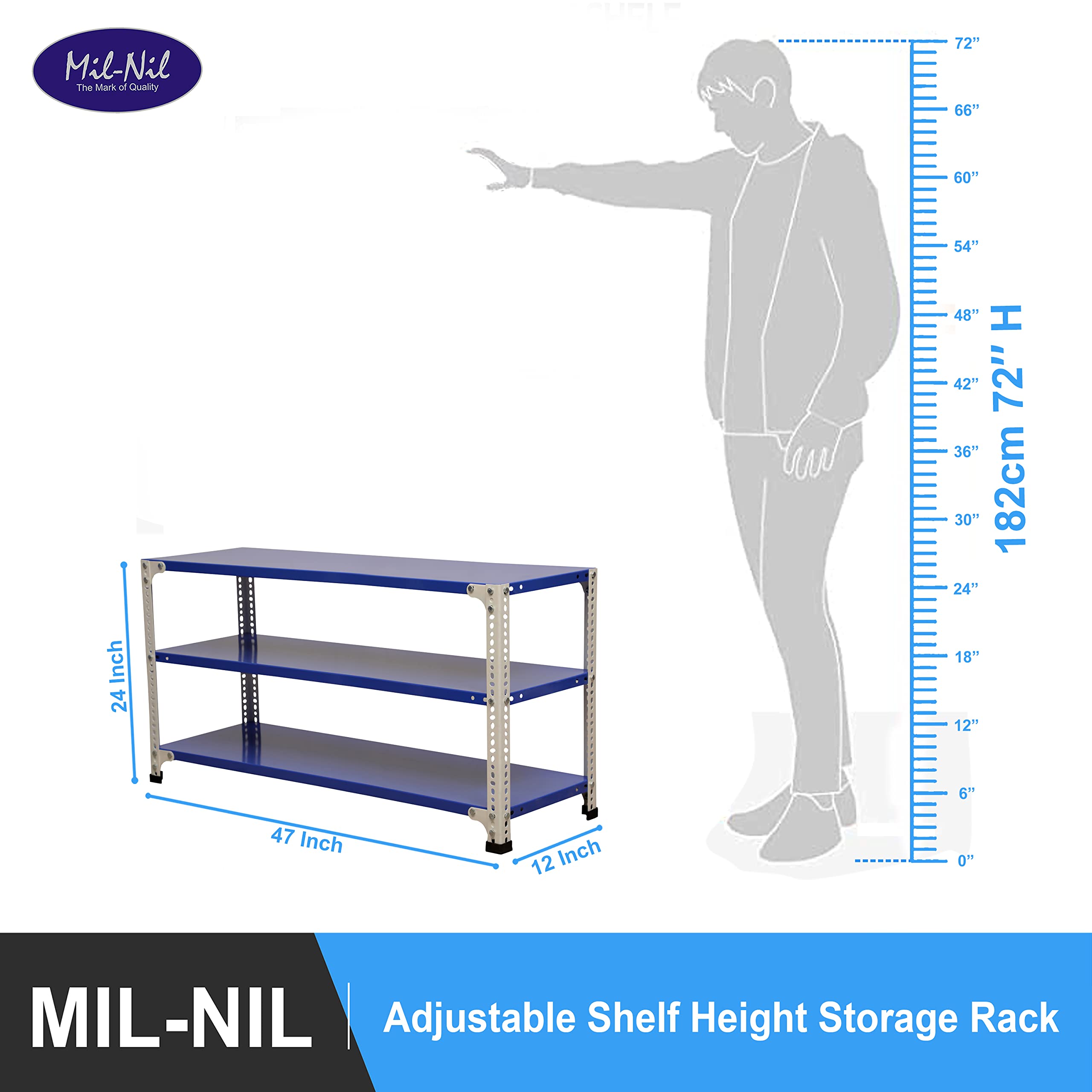 Item NameMil-Nil Prime CRC Sheet 3 Shelf 22 Gauge Multipurpose Slotted Angle Rack | Adjustable Shelf Hight Powder Coated Rack for Home & Kitchen (24x47x12 Inch Blue/White) 16 Gauge Angles