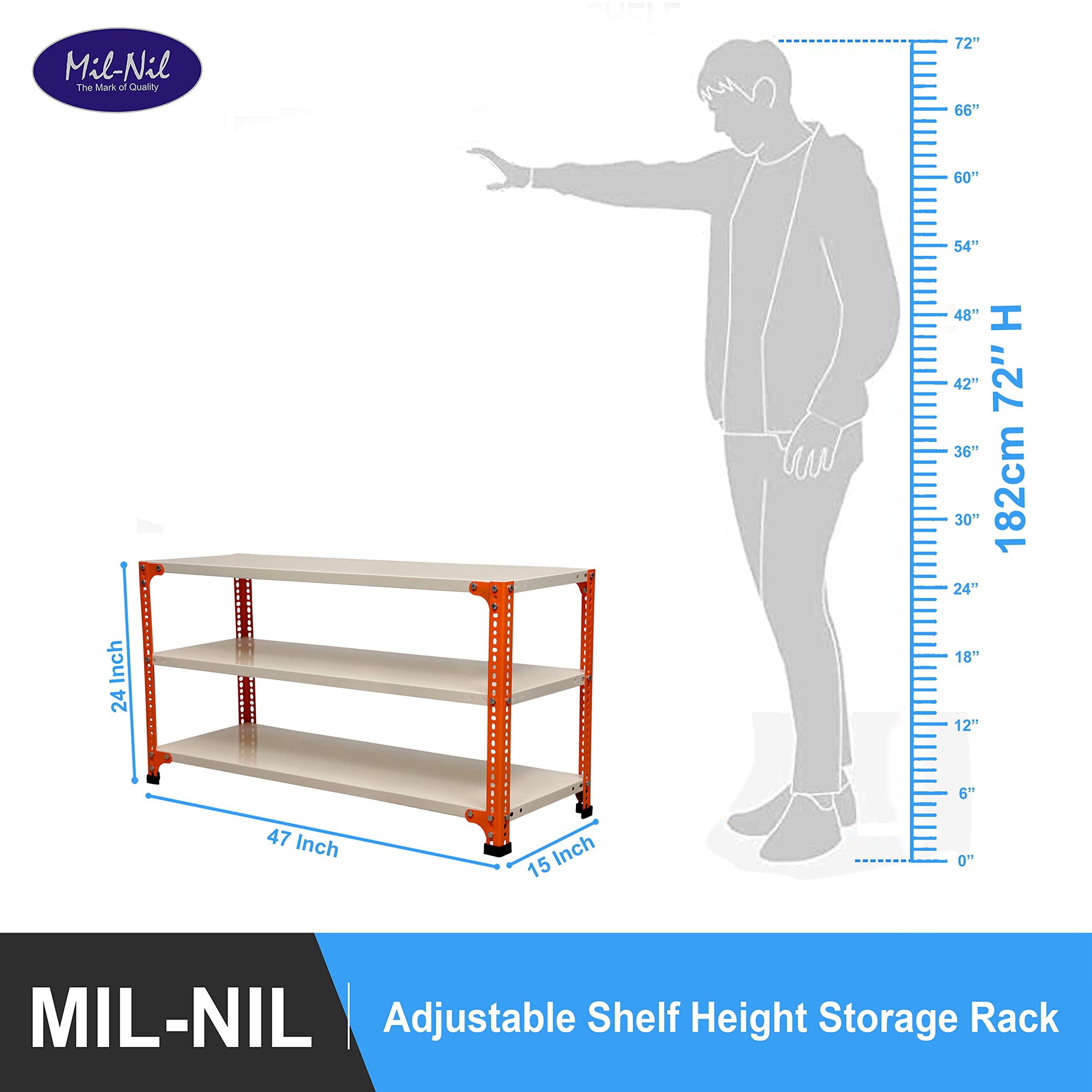 Item NameMil-Nil Prime CRC Sheet 3 Shelf 22 Gauge Multipurpose Slotted Angle Rack | Adjustable Shelf Hight Powder Coated Rack for Home & Kitchen (24x47x15 Inch, 12.8 Kg, Orange/Ivory) 16 Gauge Angles