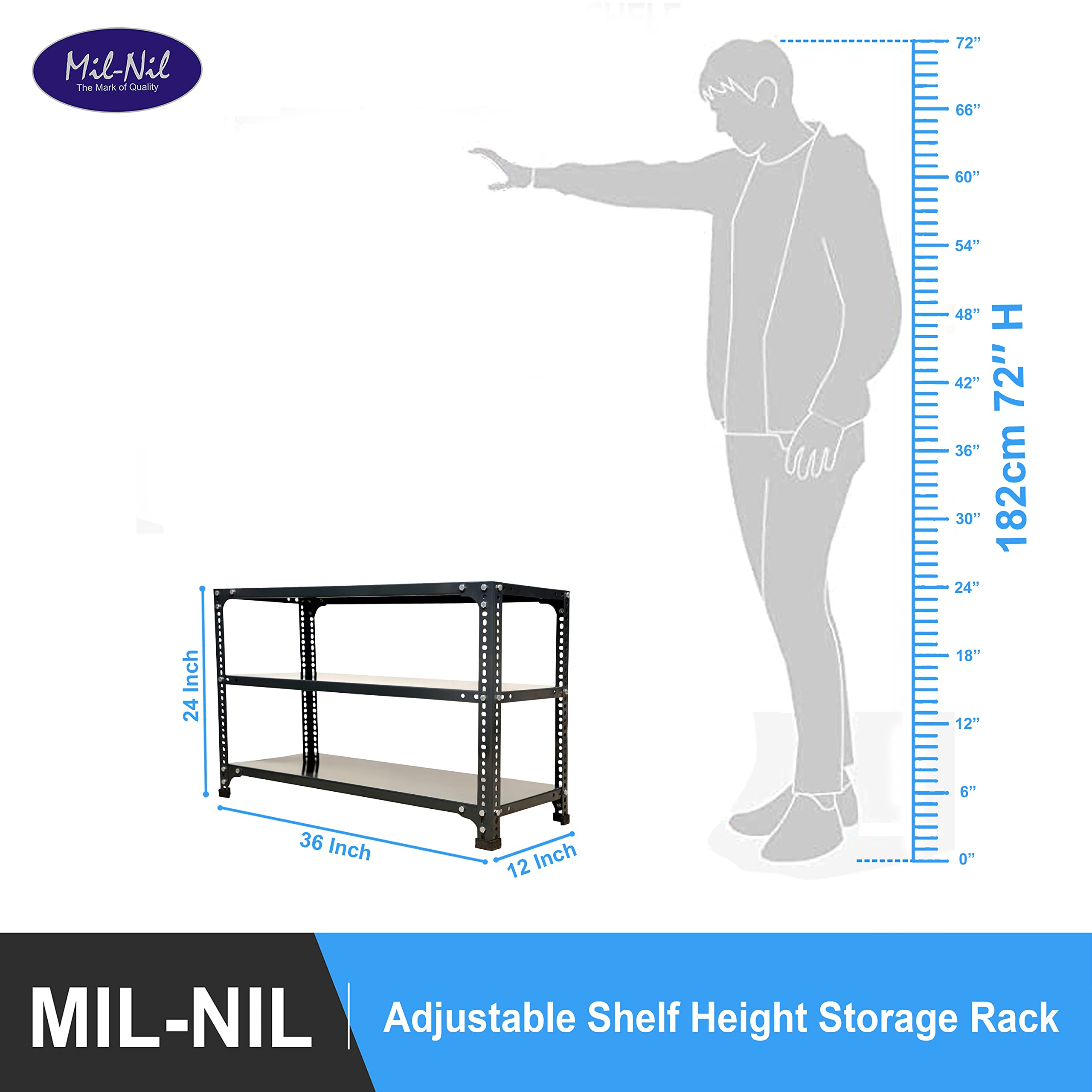 Item NameMil-Nil Prime CRC Sheet 3 Shelf 22 Gauge Multipurpose Slotted Angle Rack | Adjustable Shelf Hight Rack for Home & Kitchen (24x36x12 Inch, 9 Kg, Grey) 16 Gauge Angles