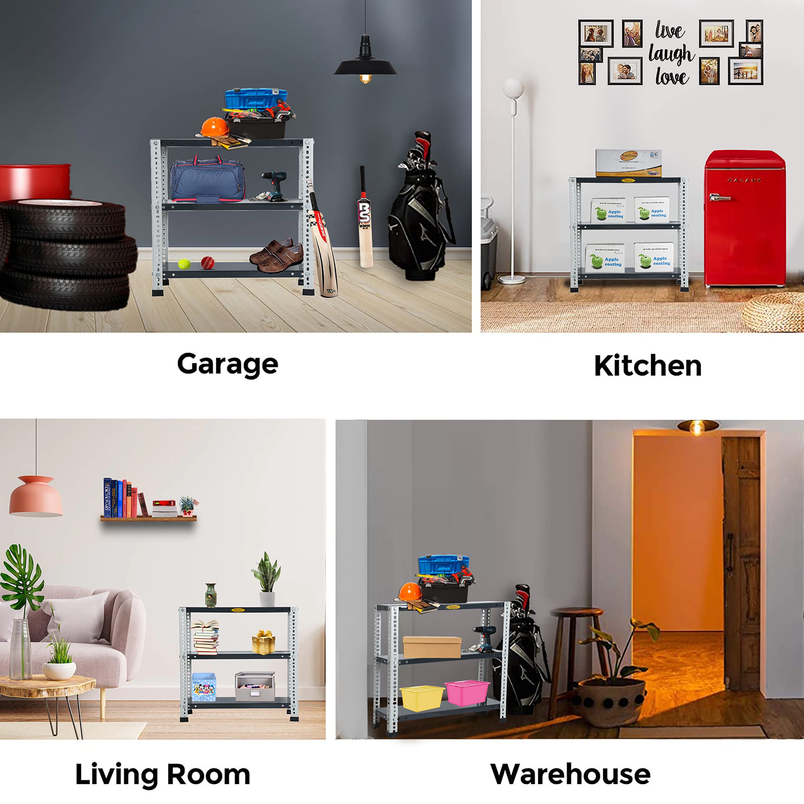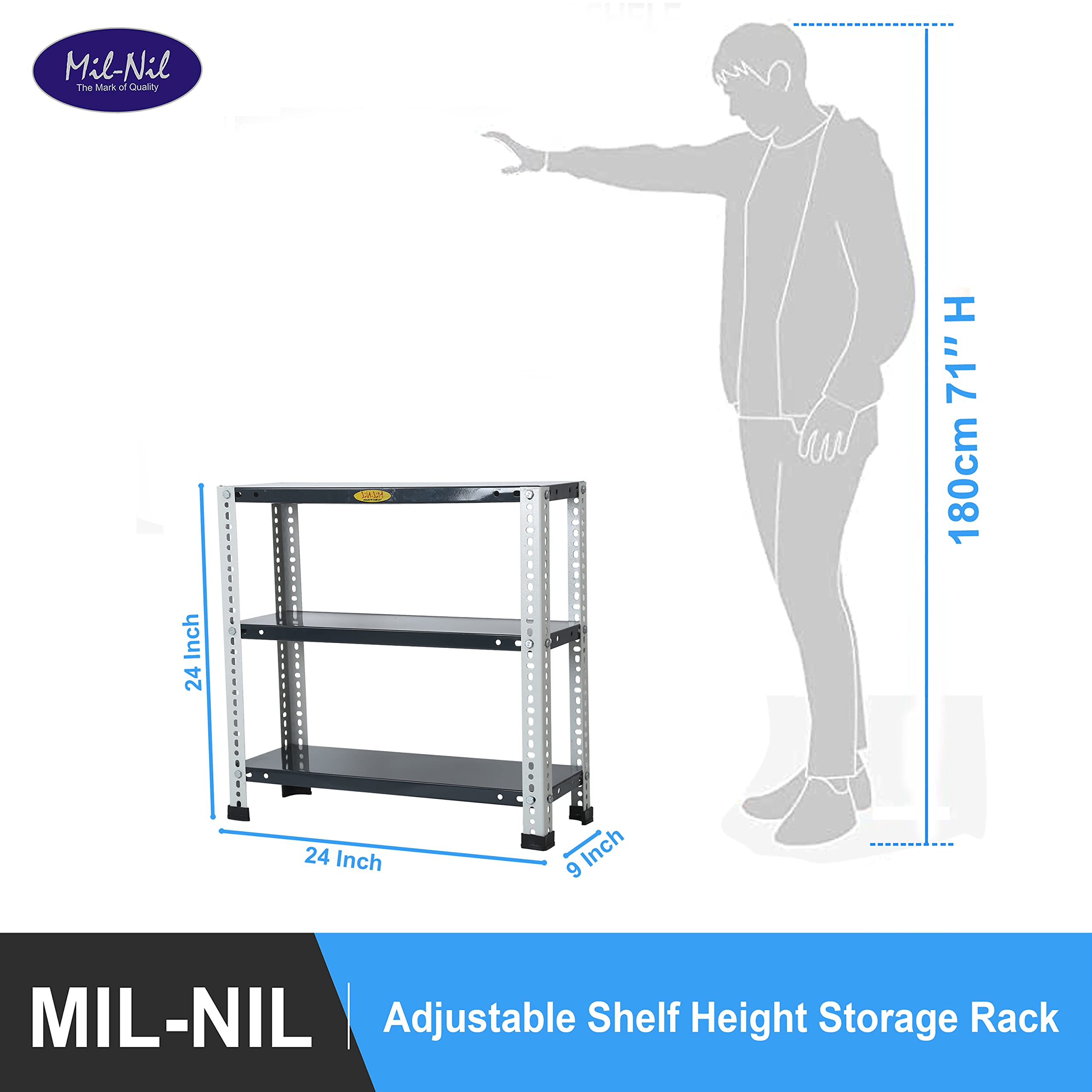 Mil-Nil Prime CRC Sheet 3 Shelf 24 Gauge Multipurpose Slotted Angle Rack | Adjustable Shelf Hight for Home & Kitchen 18 Gauge Angle (24X24X9 inches, 5.3 Kg, Grey/Havells)