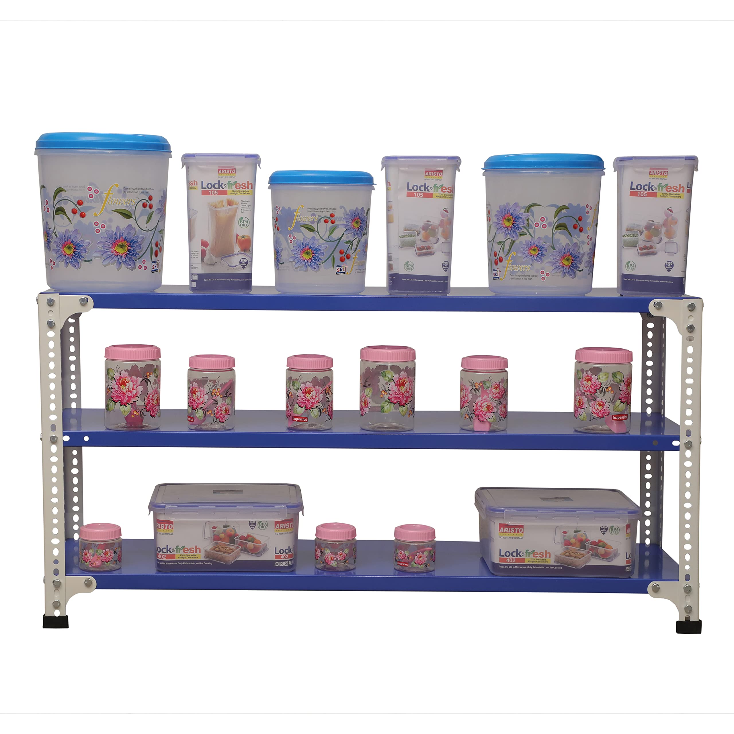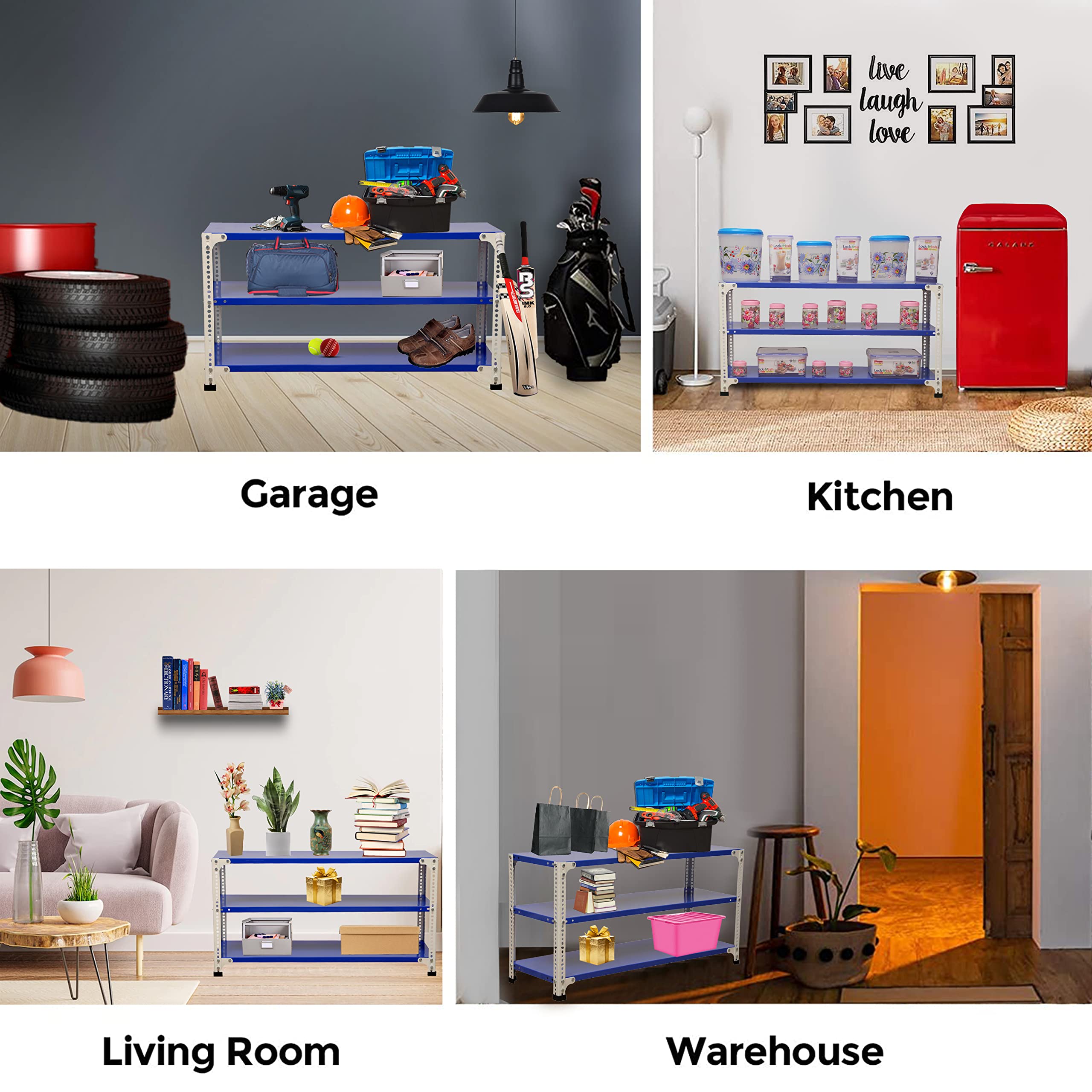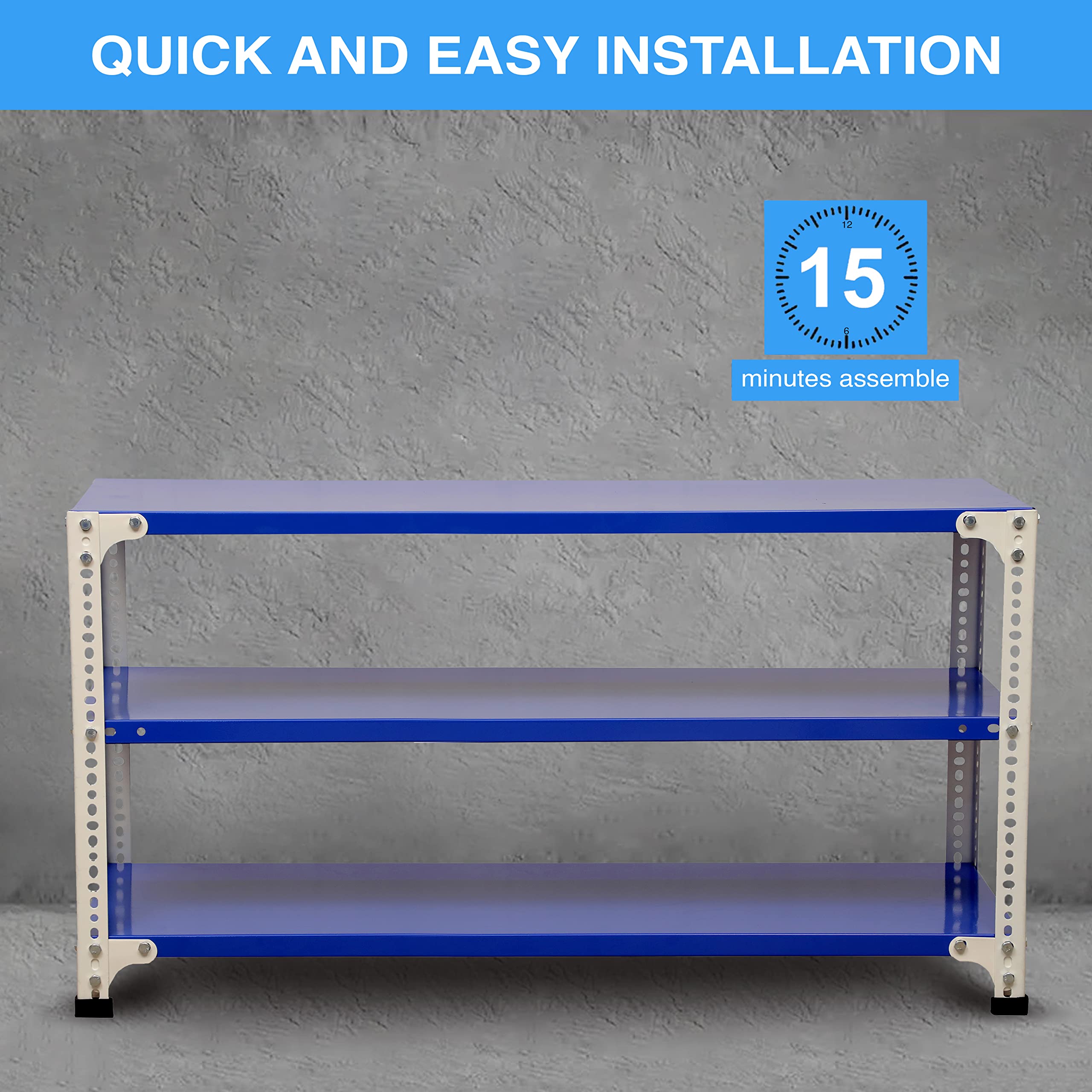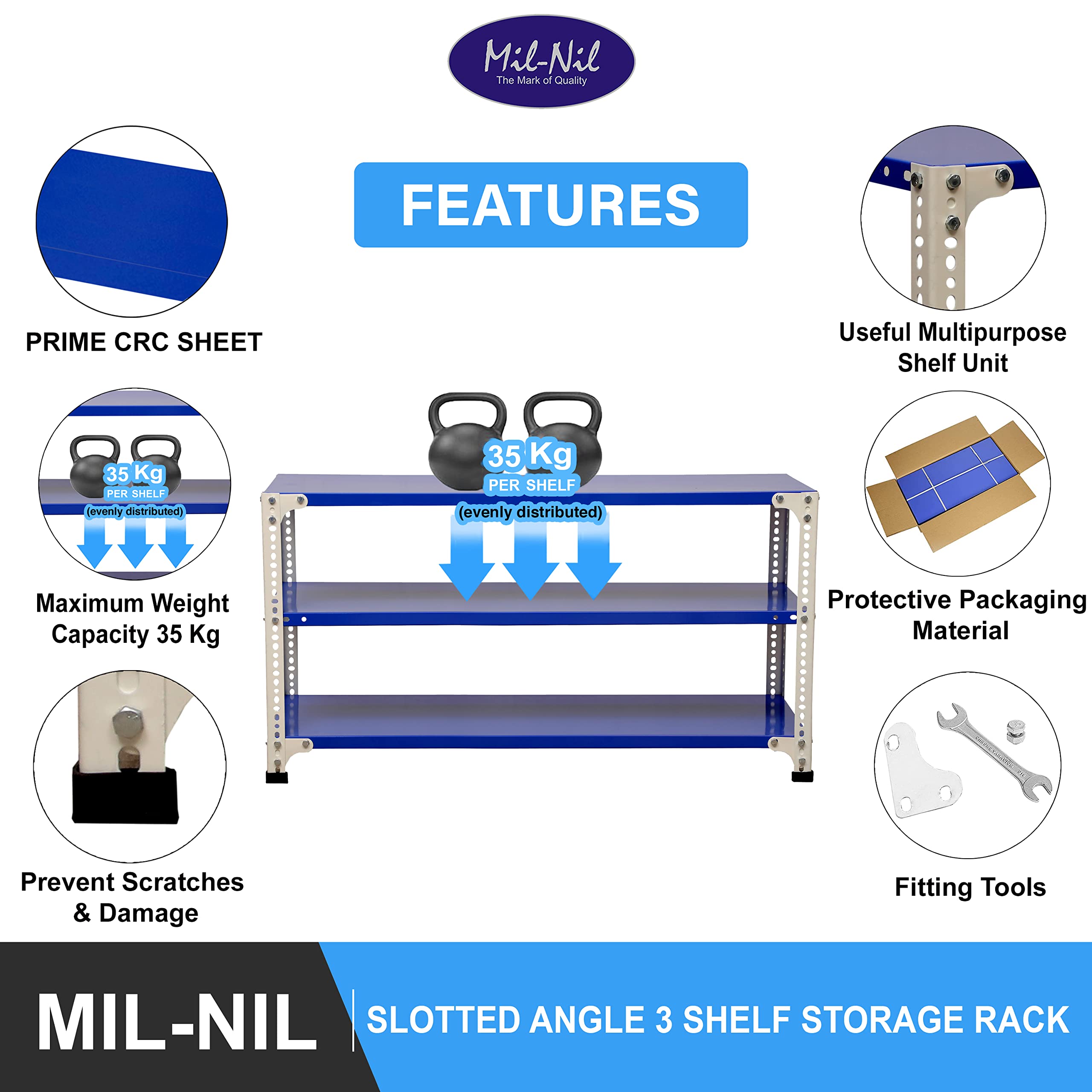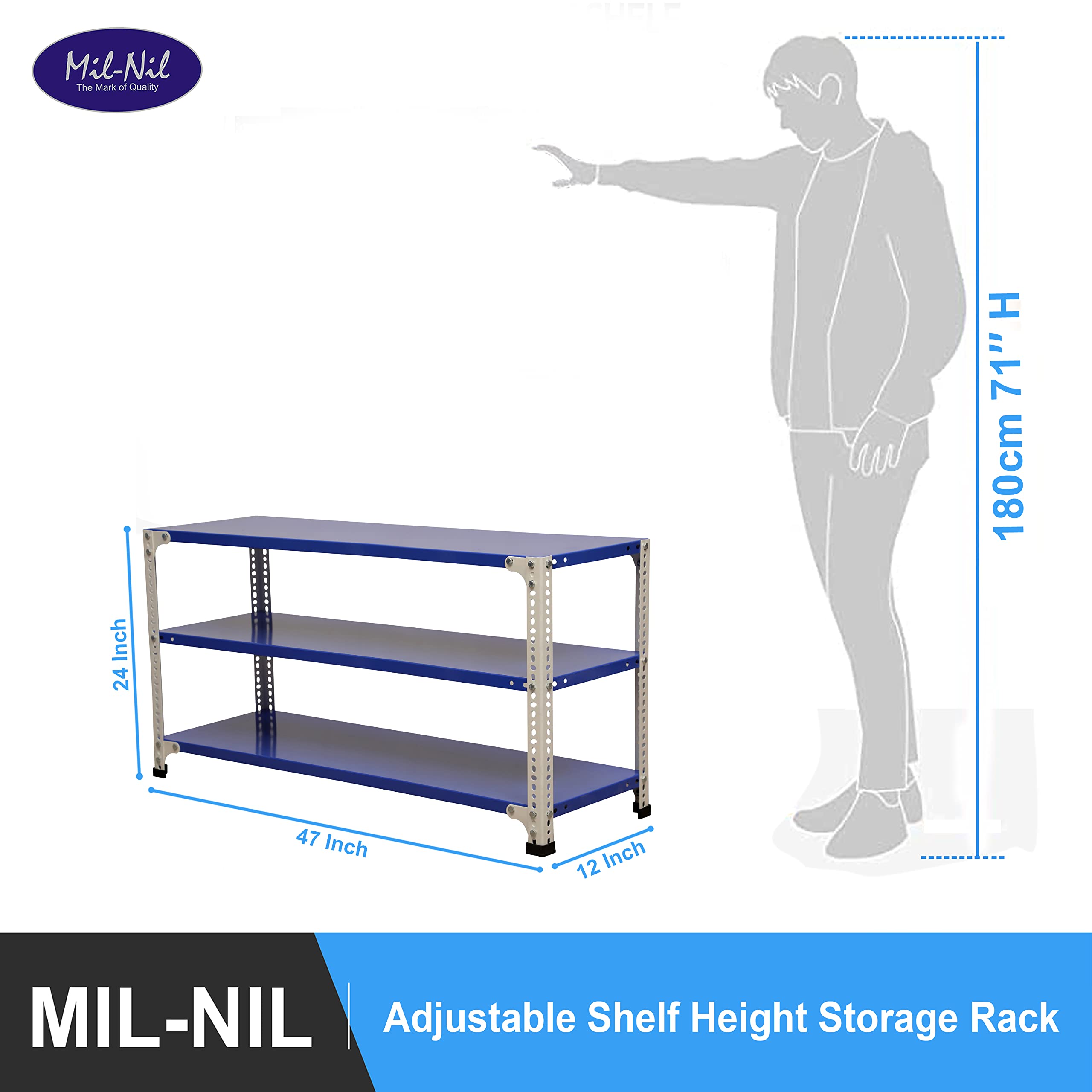 Item NameMil-Nil Prime CRC Sheet 3 Shelf 24 Gauge Multipurpose Slotted Angle Rack | Adjustable Shelf Hight Powder Coated Rack for Home & Kitchen (24x47x12 Inch, 9.6 Kg, Blue/White) 16 Gauge Angles