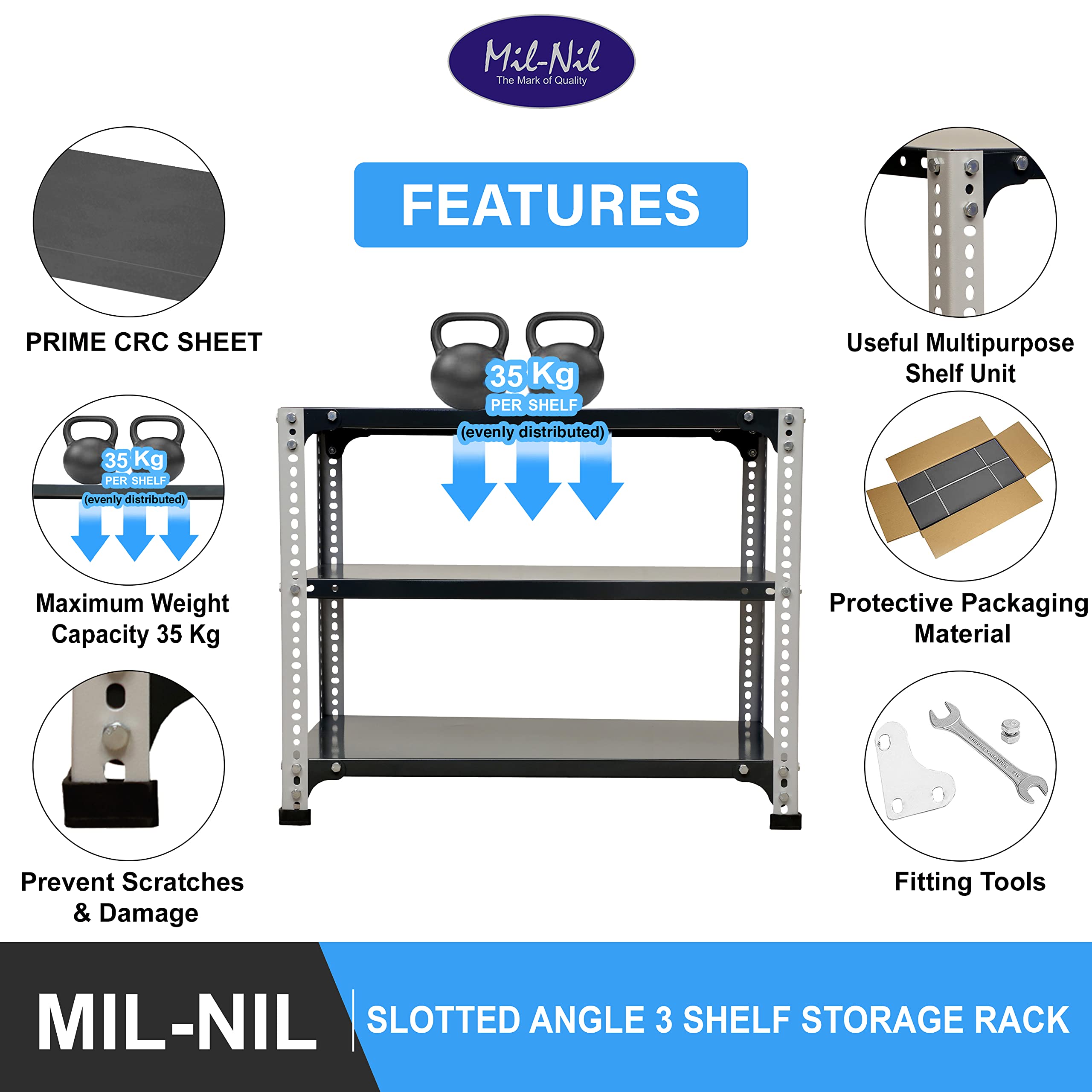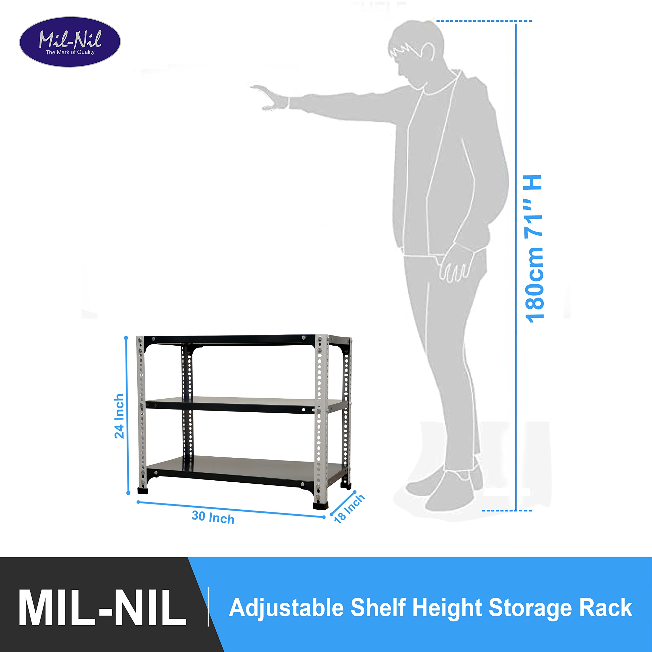 Item NameMil-Nil Prime CRC Sheet 3 Shelf 24 Gauge Multipurpose Slotted Angle Rack | Adjustable Shelf Hight Rack for Home & Kitchen (24x30x18 Inch, 10 Kg, Grey/Havels) 16 Gauge Angles