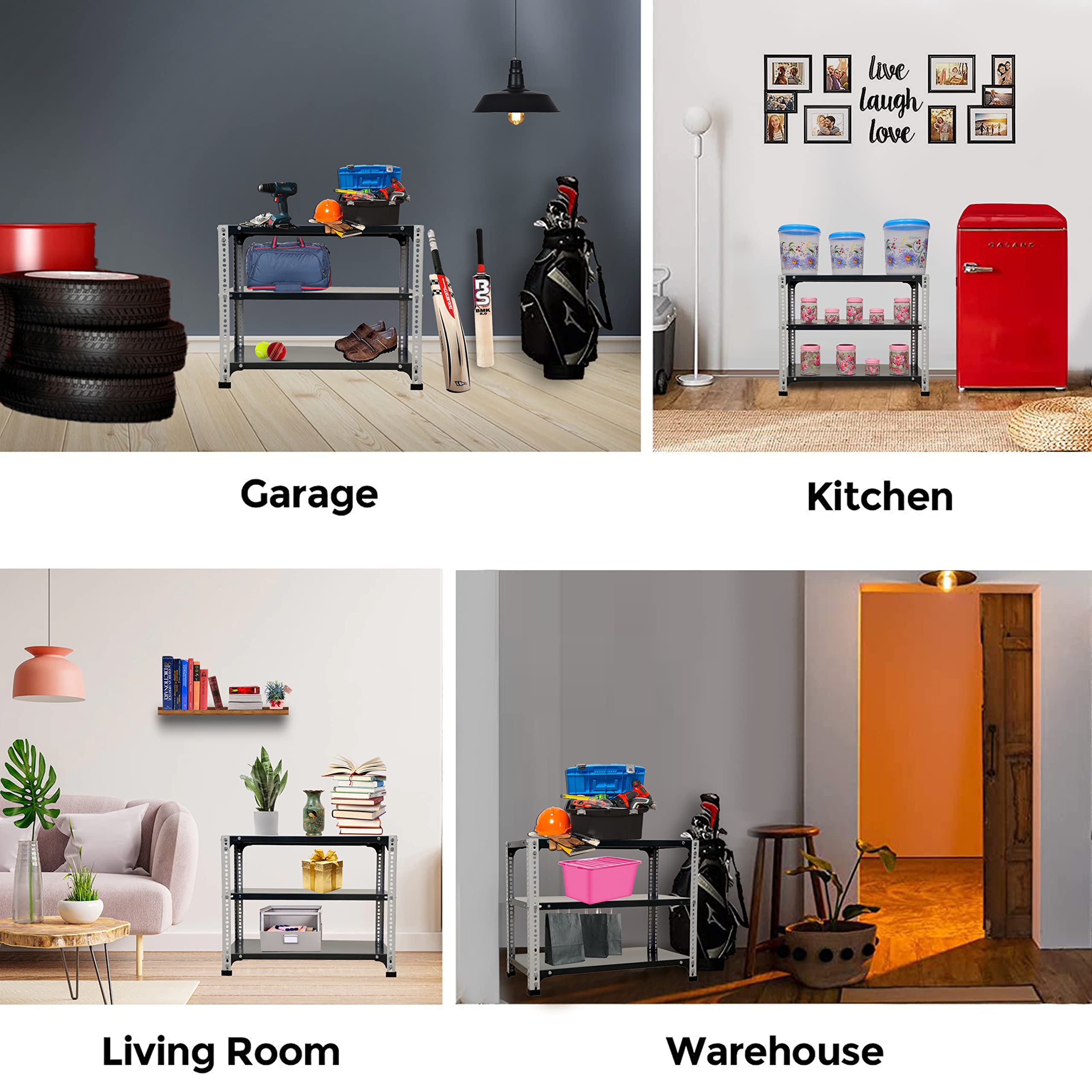 Bullet Point 4✔ MATERIAL: PRIME CRC SHEET, Iron Slotted Angle, Free Protective Rubber Feet. Usage: It's a Multipurpose Storage rack that can be used as a kitchen rack, book rack, cloth rack, office rack, living room rack, Industries rack, etc.