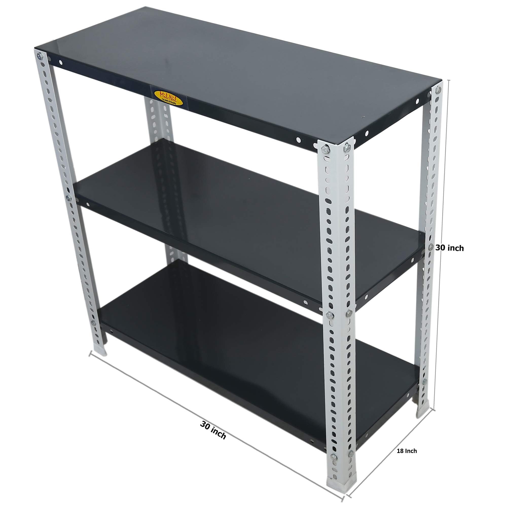 Item NameMil-Nil Prime CRC Sheet 3 Shelf Multipurpose Slotted Angle Rack, 30 x 30 x 18 Inch, 24 Gauge [Grey/Havels(Powder Coating)] 16 Gauge Angles