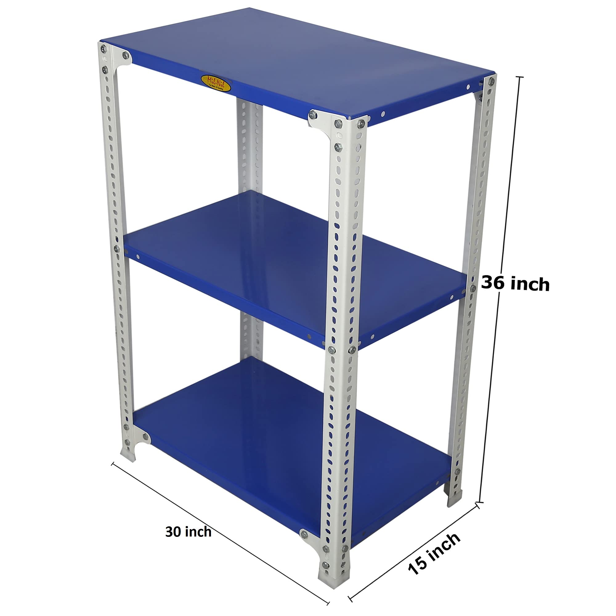 Item NameMil-Nil Prime CRC Sheet 36x30x15 Inch Multipurpose Storage, Adjustable Shelf, Slotted Angle Rack with 3 Shelves 22 Gauge_Blue/White 16 Gauge Angles