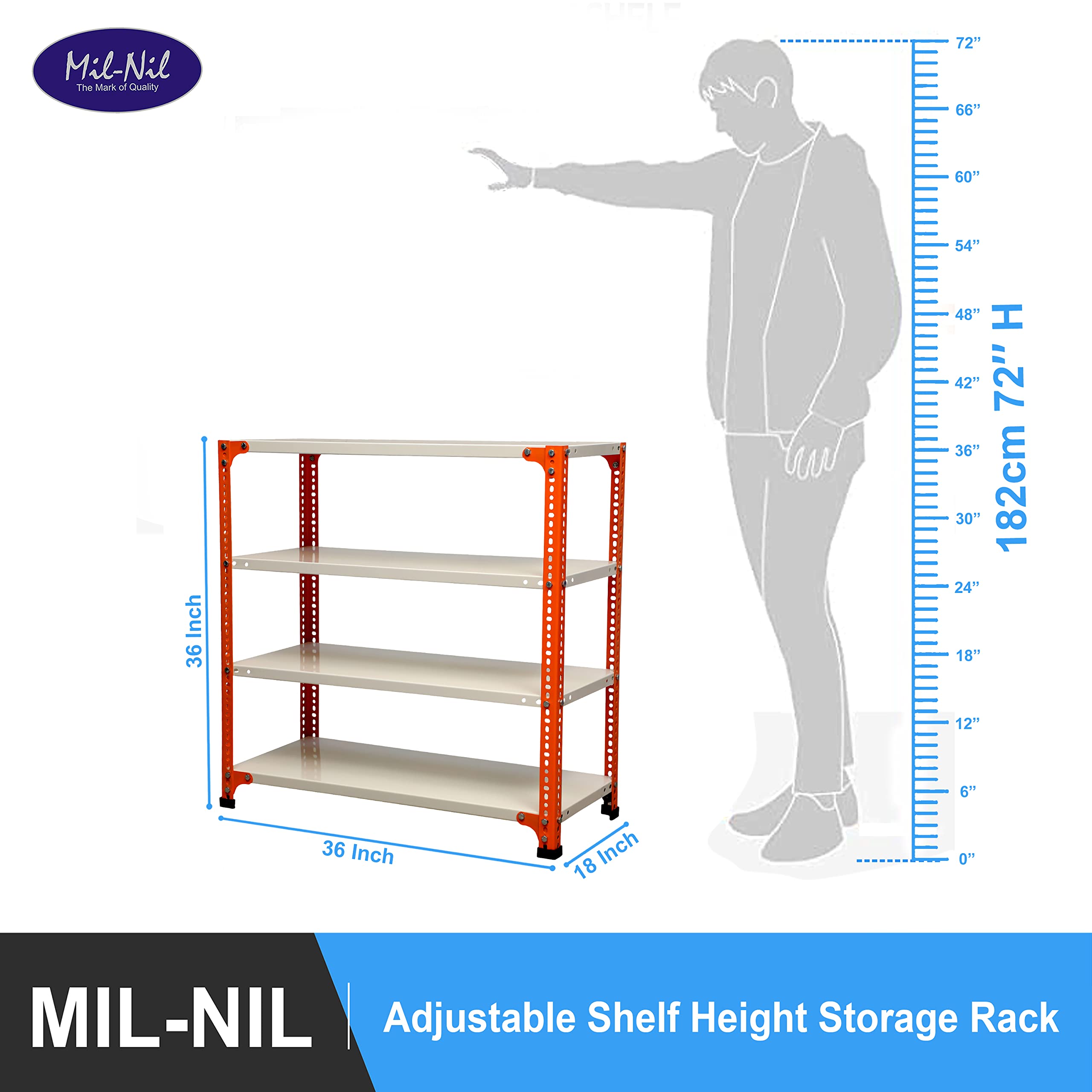 Item NameMil-Nil Prime CRC Sheet 4 Shelf 22 Gauge Multipurpose Slotted Angle Rack | Adjustable Shelf Hight Powder Coated Rack for Home & Kitchen (36x36x18 Inch, 16 Kg, Orange/Ivory) 16 Gauge Angles