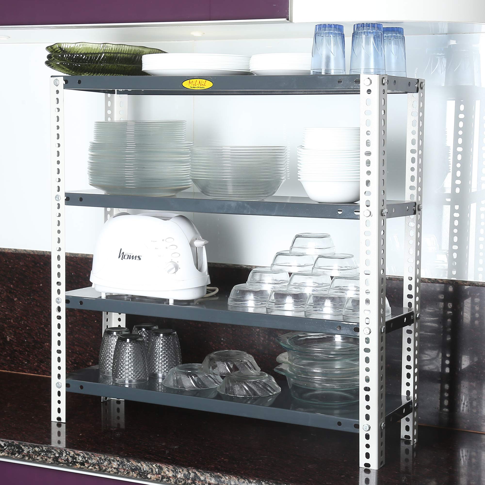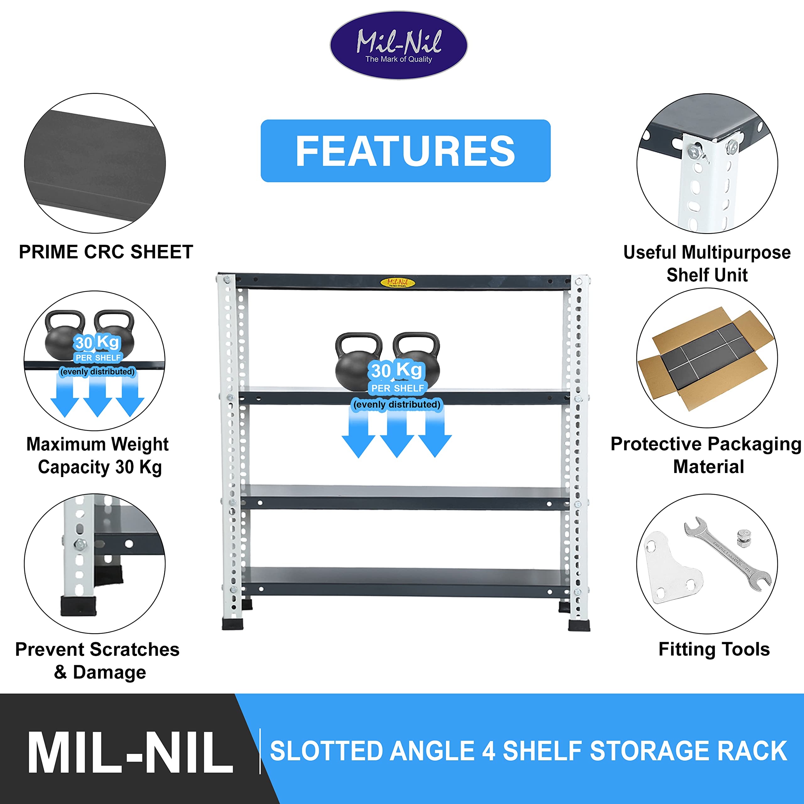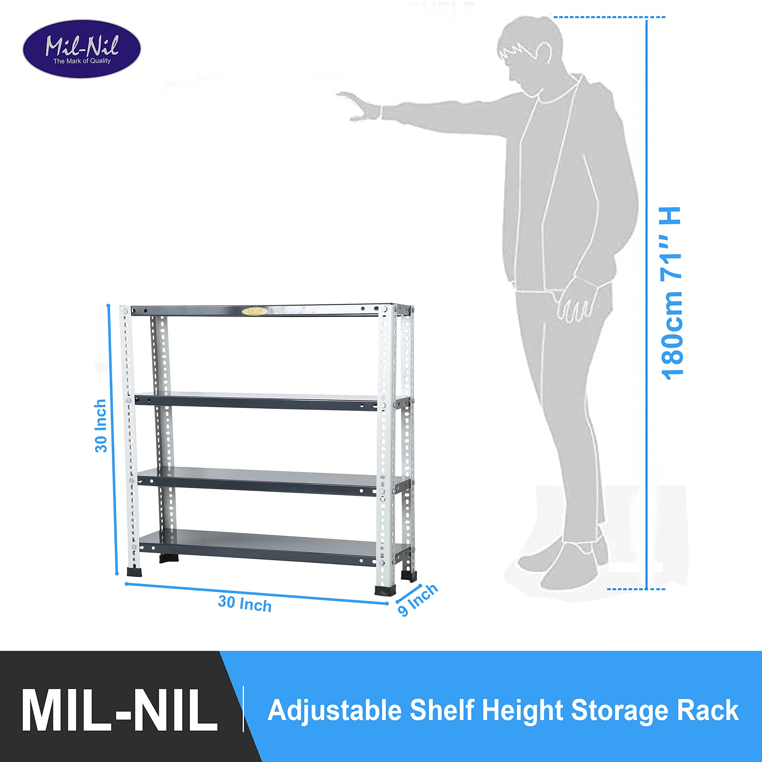Mil-Nil Prime CRC Sheet 4 Shelf 24 Gauge Multipurpose Slotted Angle Rack | Adjustable Shelf Hight for Home & Kitchen 18 Gauge Angle (30X30X9 inches, 7.5 Kg, Grey/Havells)