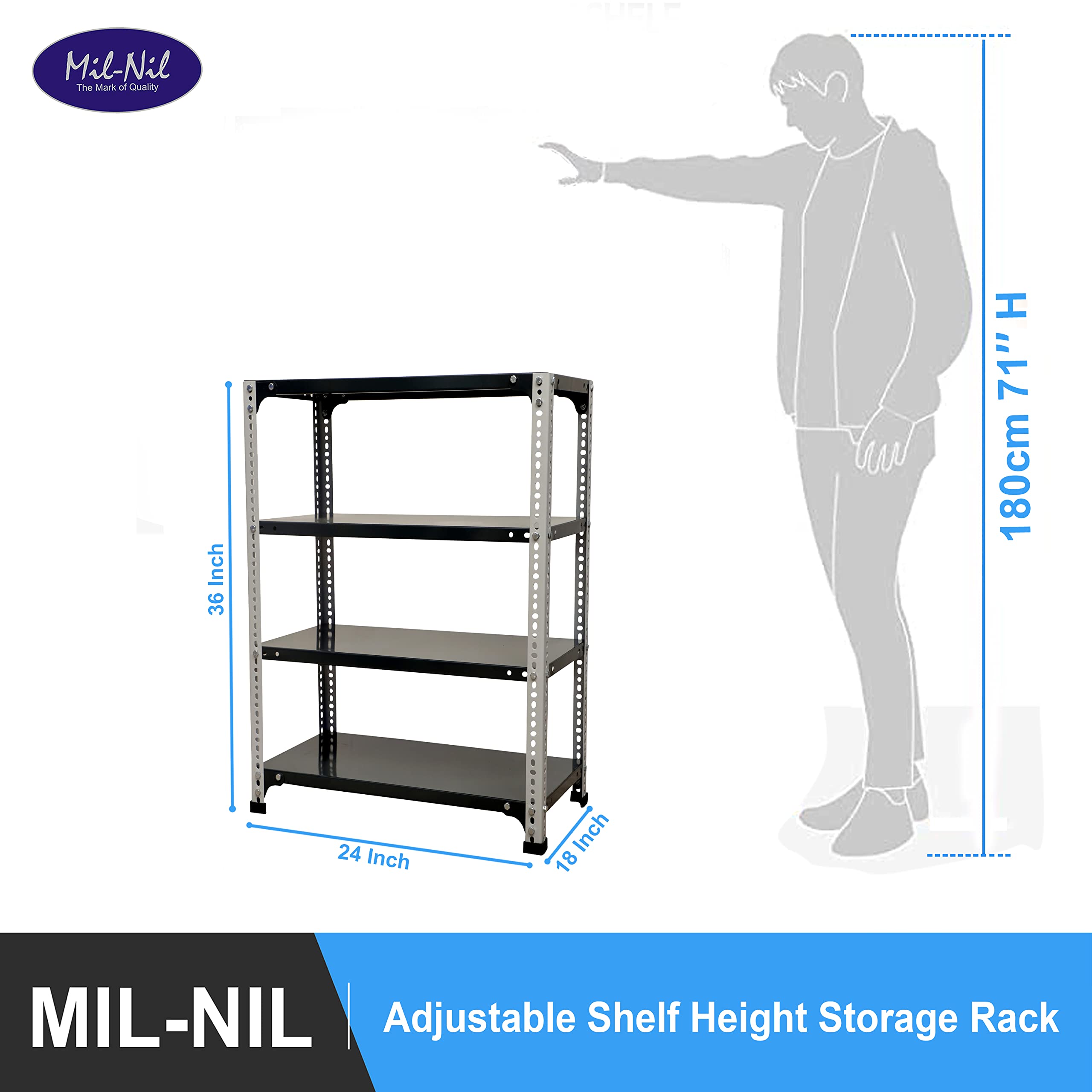 Item NameMil-Nil Prime CRC Sheet 4 Shelf 24 Gauge Multipurpose Slotted Angle Rack | Adjustable Shelf Hight Rack for Home & Kitchen (36x24x18 Inch, 12.1 Kg, Grey/Havels) 16 Gauge Angles