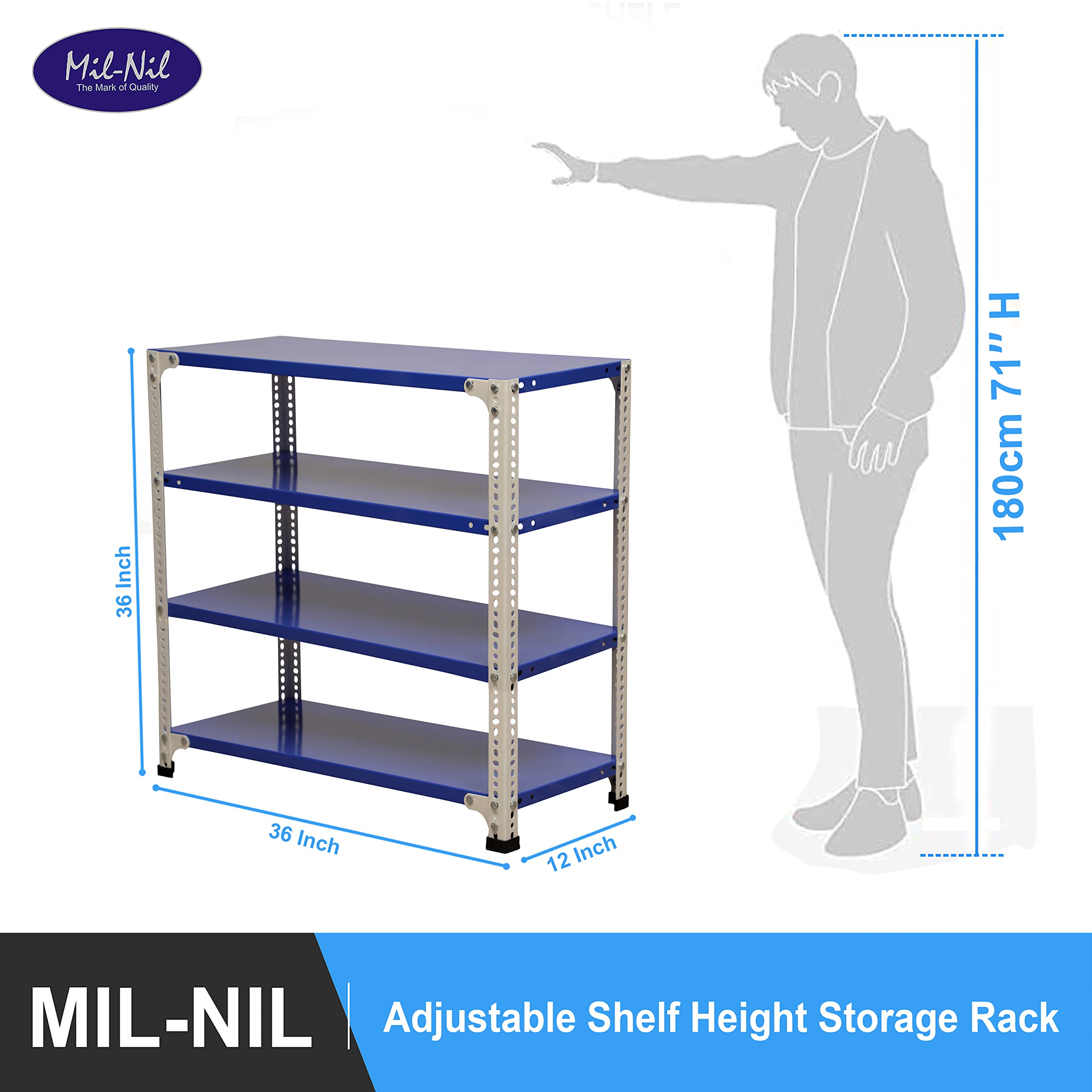 Item NameMil-Nil Prime CRC Sheet 4 Shelf 24 Gauge Multipurpose Slotted Angle Rack | Adjustable Shelf Hight Rack for Home & Kitchen (36x36x12 Inch, 11.6 Kg, Blue/Whie) 16 Gauge Angles