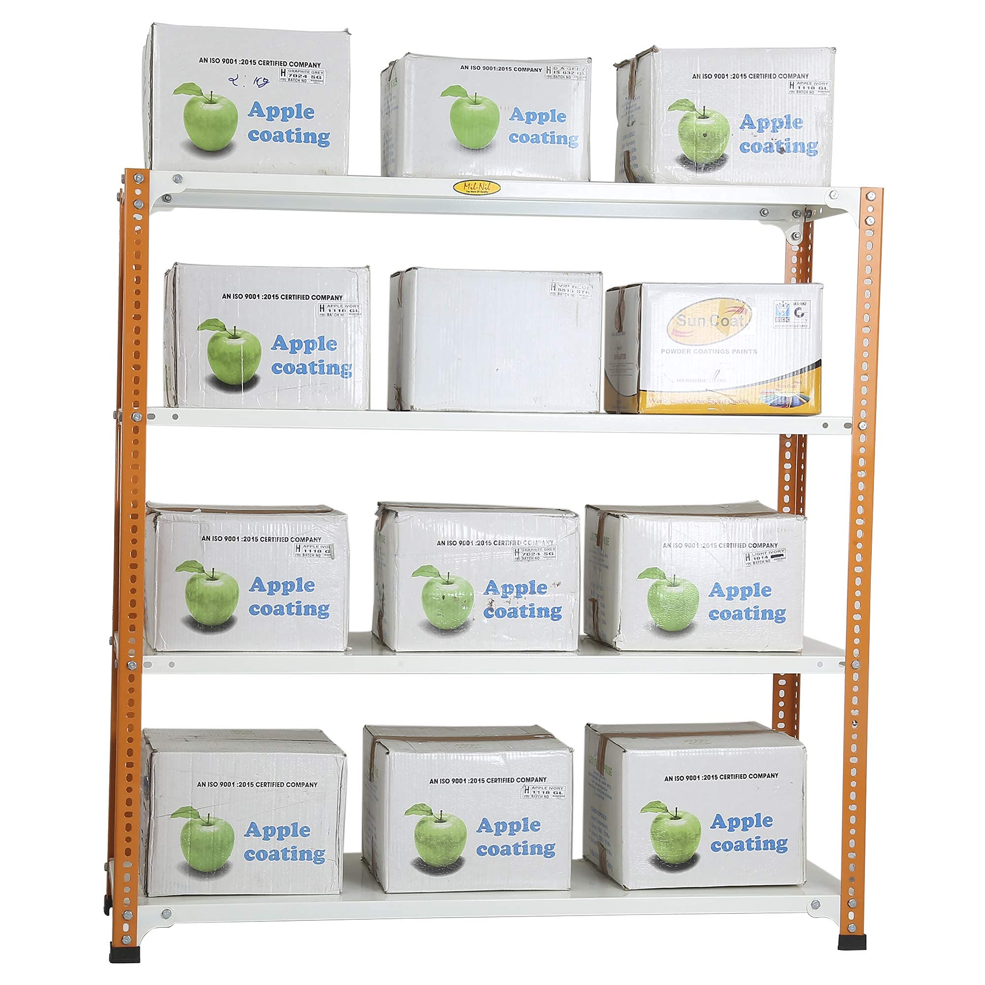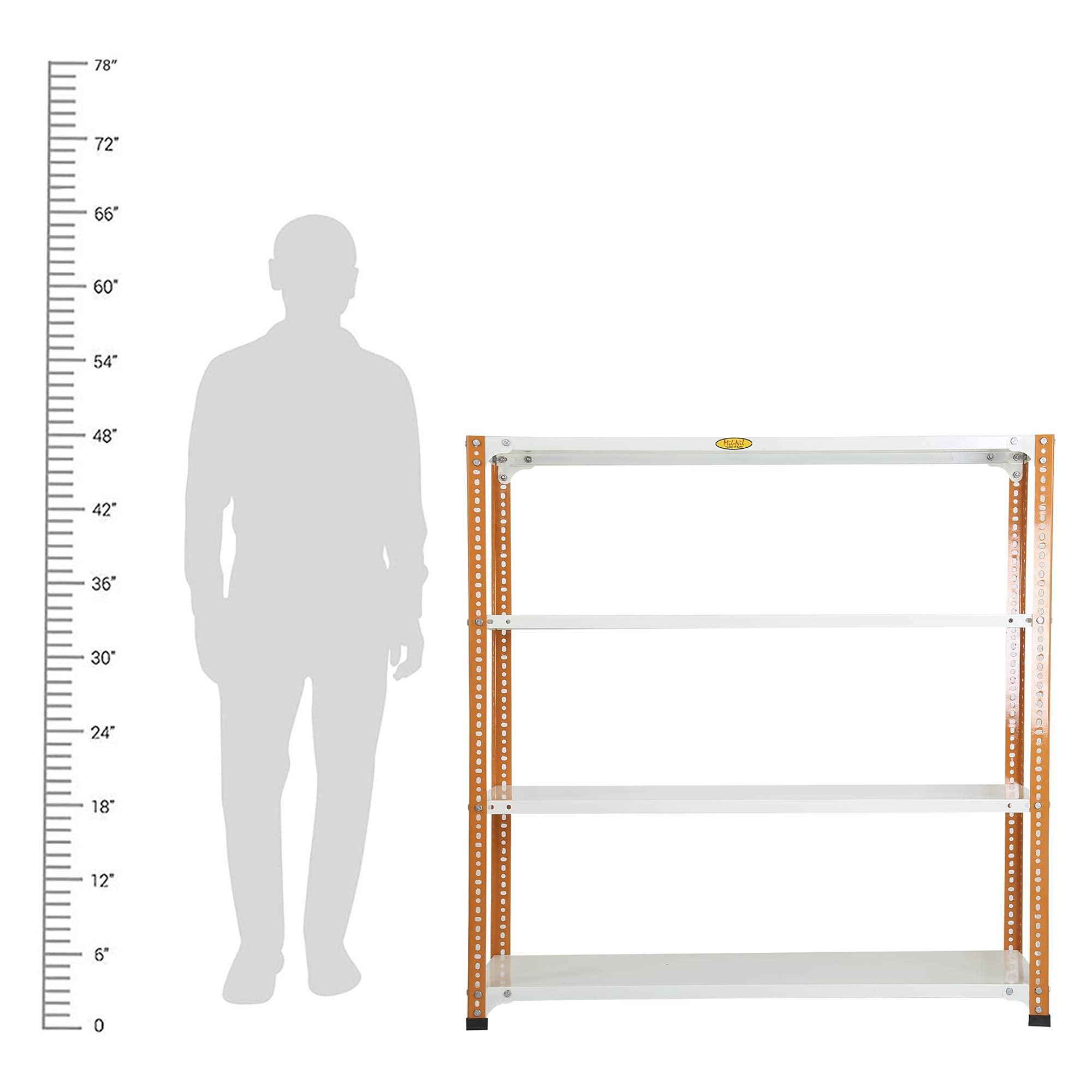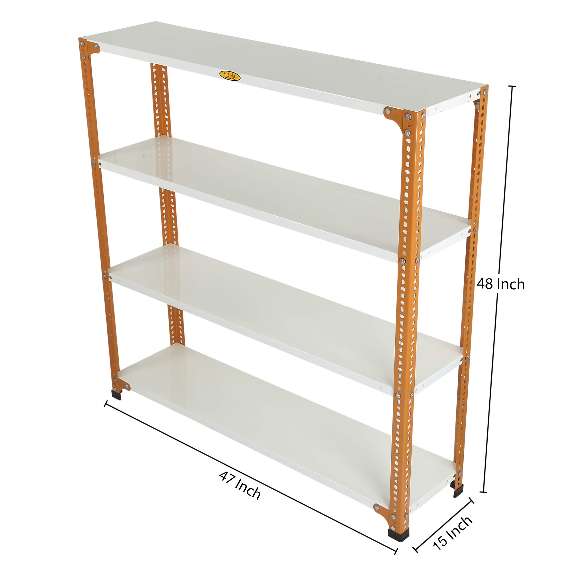 Item NameMil-Nil Prime CRC Sheet 4 Shelf Multipurpose Slotted Angle Rack, 48 x 47 x 15 Inch, 20 Gauge (Orange/Ivory) Powder Coated 14 Gauge Angles