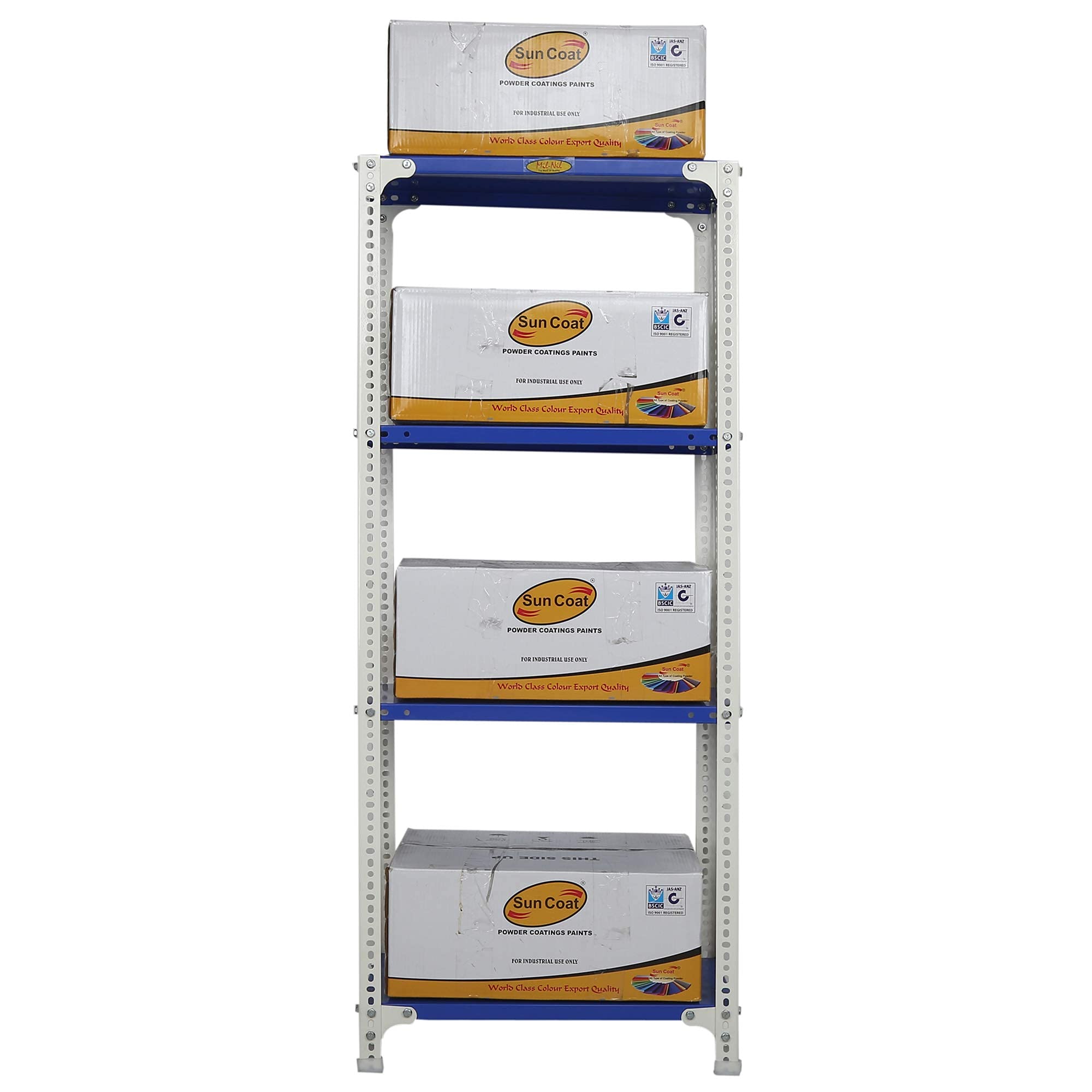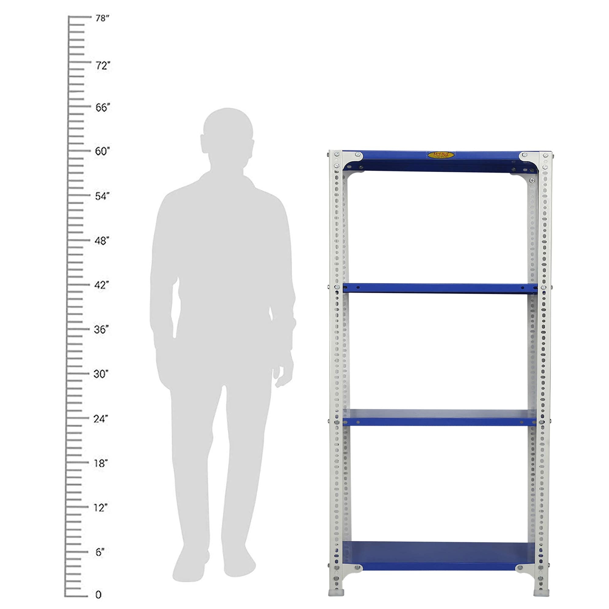 Item NameMil-Nil Prime CRC Sheet 4 Shelf Multipurpose Slotted Angle Rack, 60 x 24 x 12 Inch [(Blue-White) Powder Coating] 16 Gauge Angles