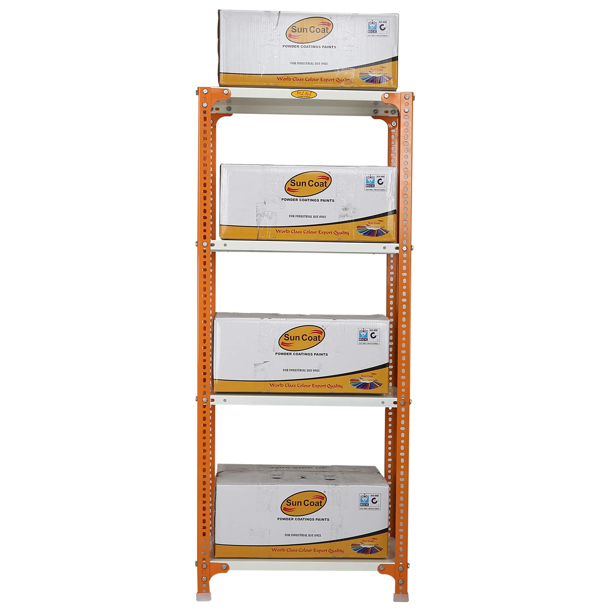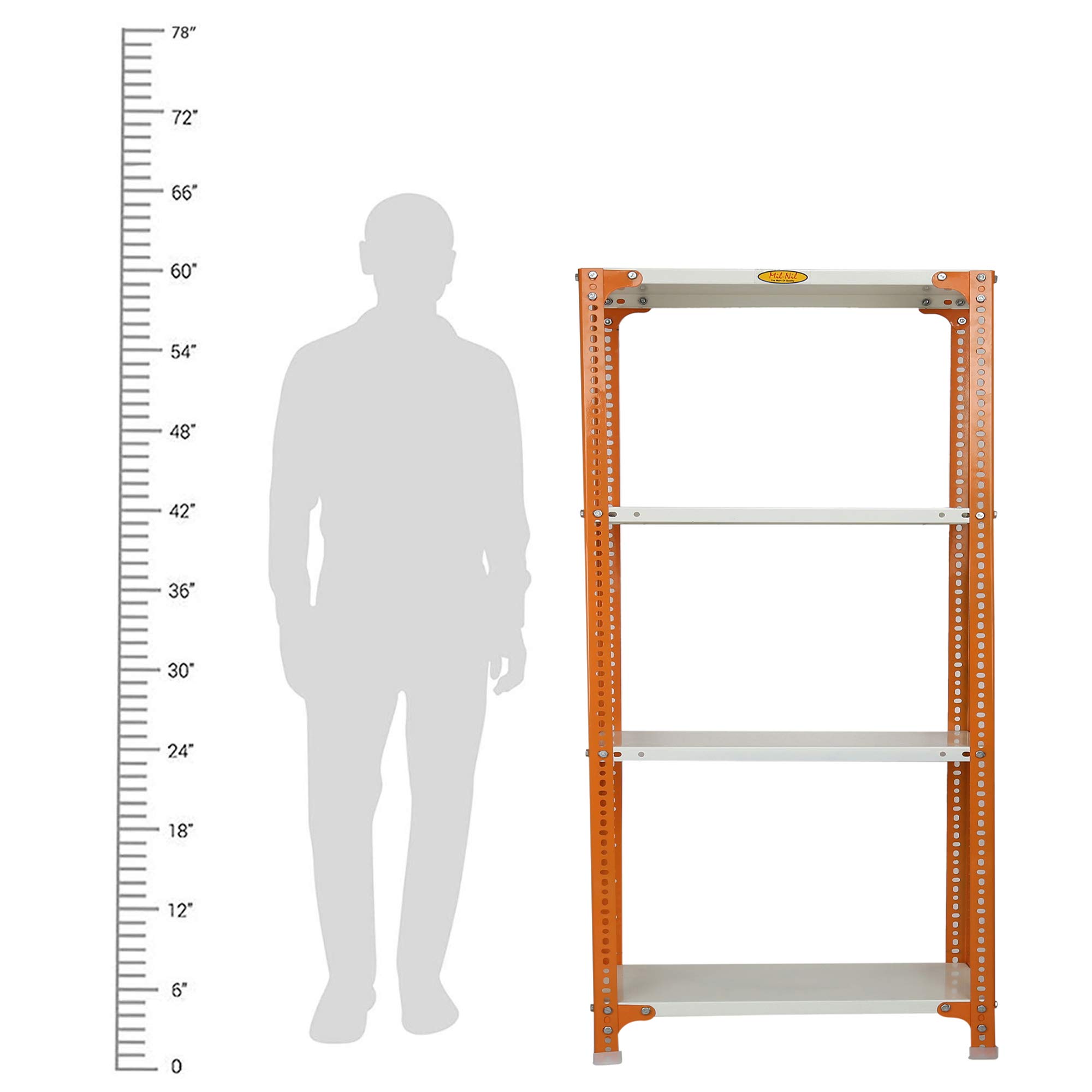 Item NameMil-Nil Prime CRC Sheet 4 Shelf Multipurpose Slotted Angle Rack, 60 x 24 x 12 Inch [(Orange-Ivory) Powder Coating] 16 Gauge Angles
