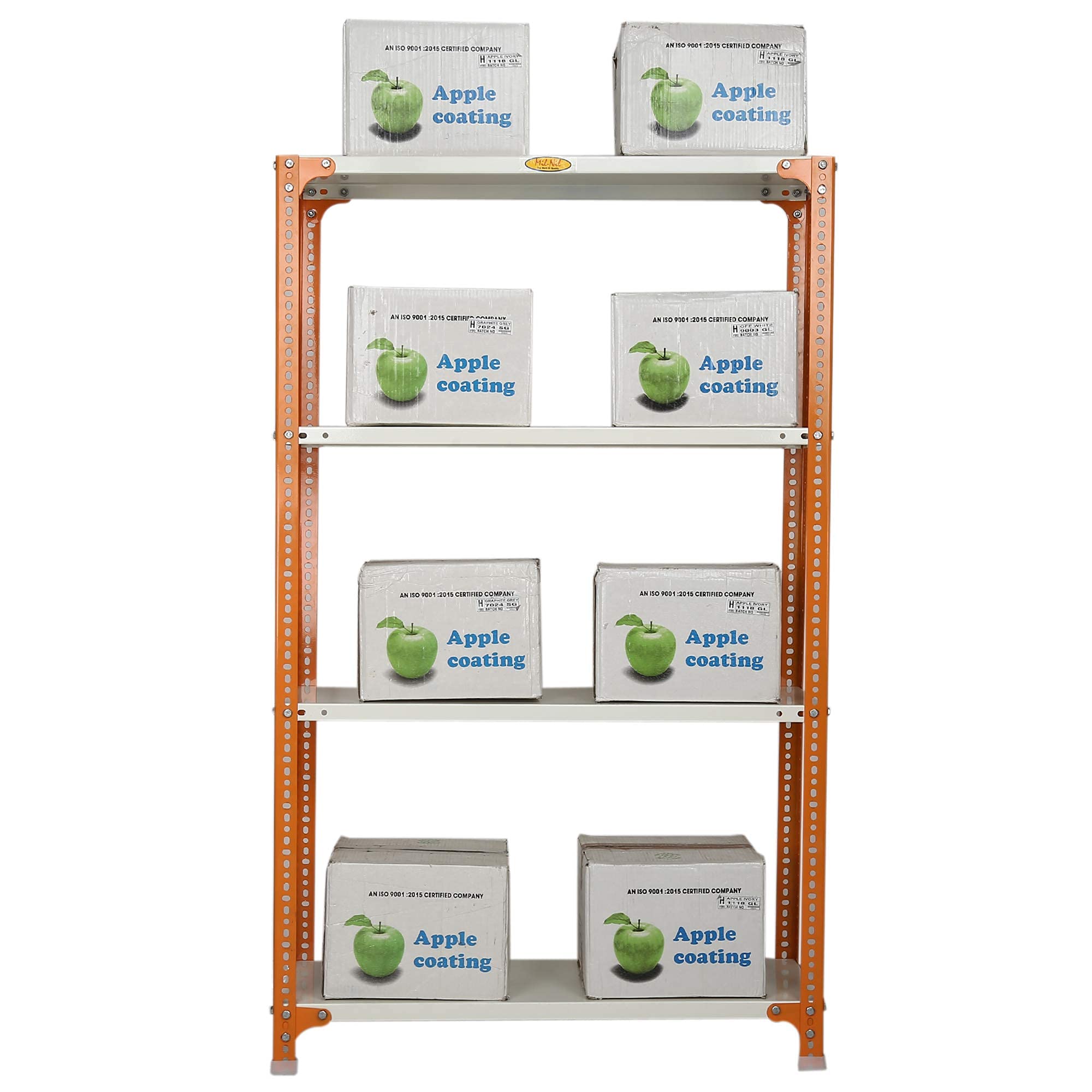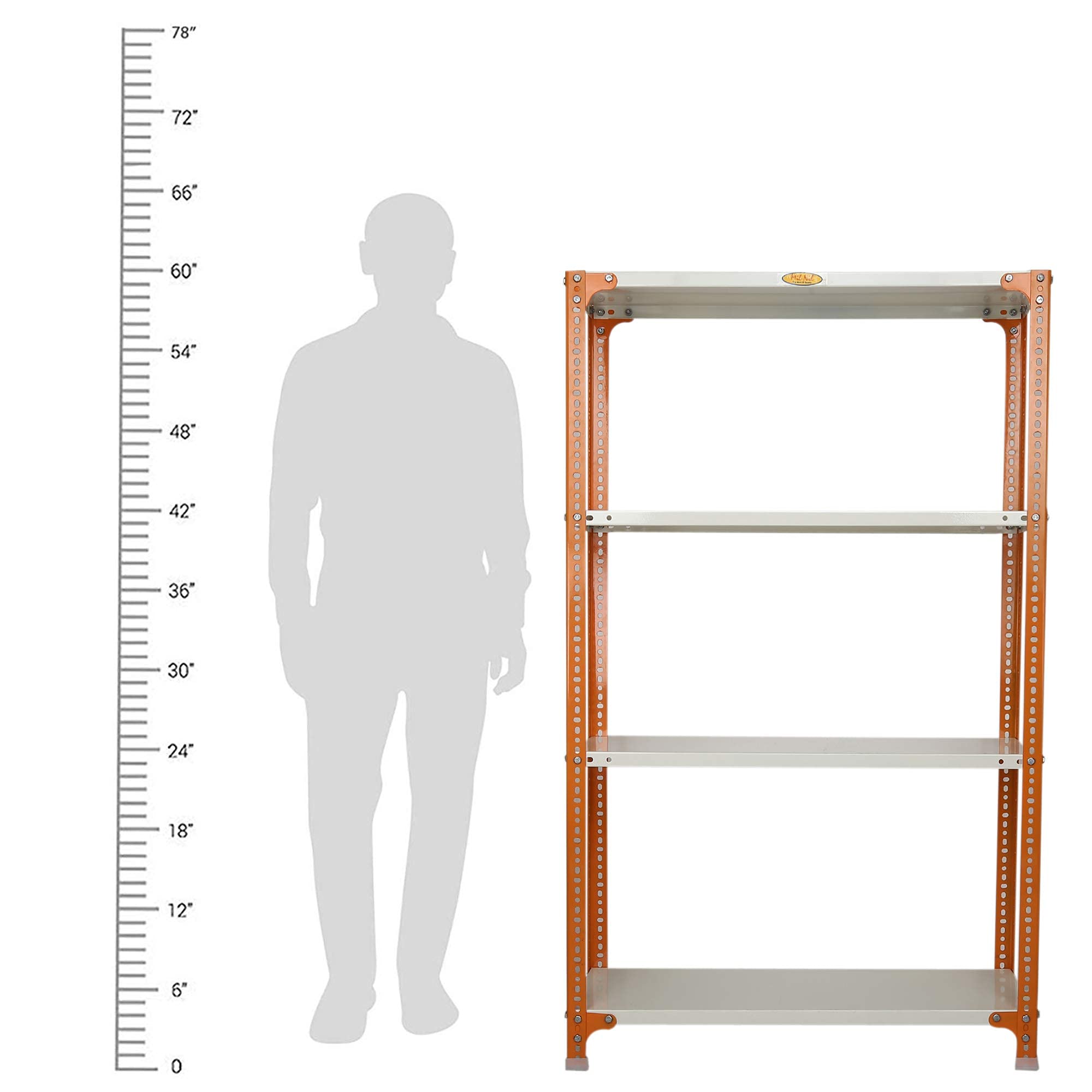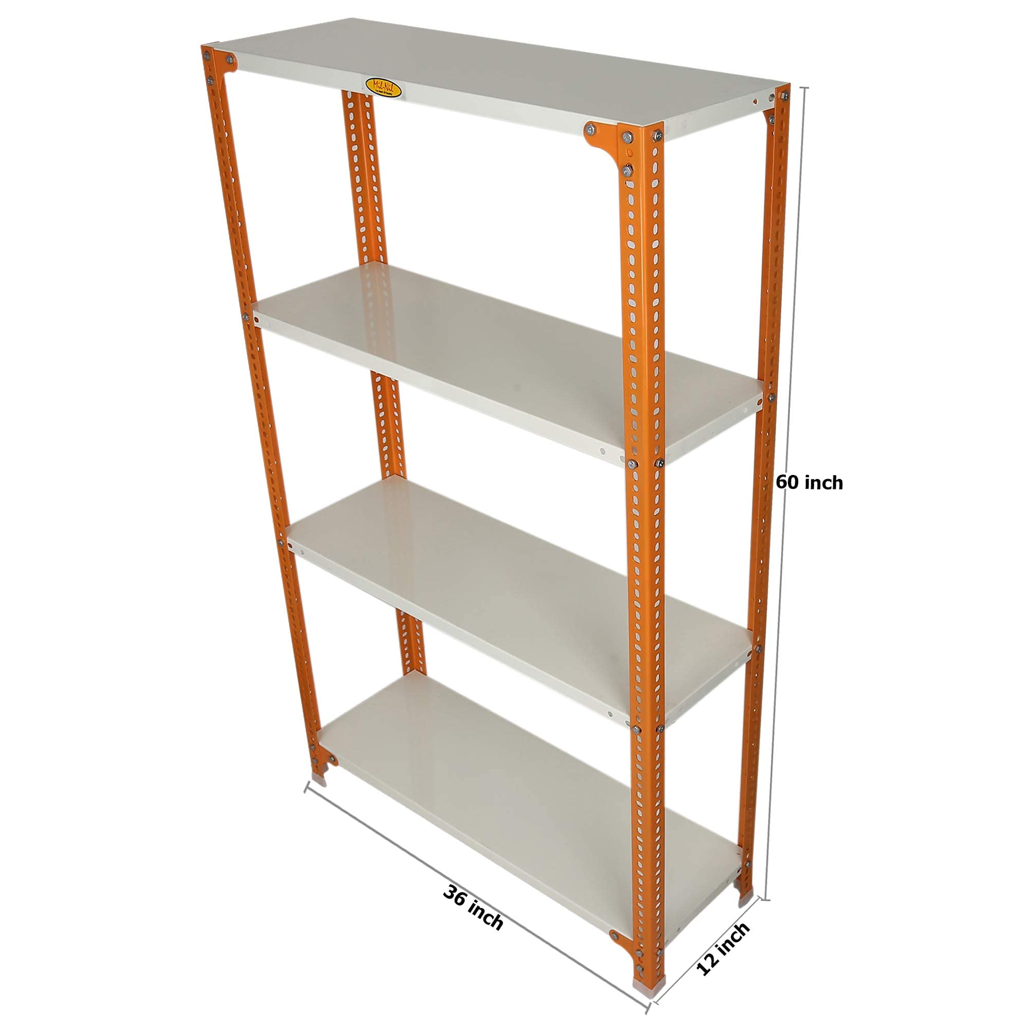 Item NameMil-Nil Prime CRC Sheet 4 Shelf Multipurpose Slotted Angle Rack, 60 x 36 x 12 Inch, 20 Gauge [(Orange-Ivory) Powder Coating] 14 Gauge Angles