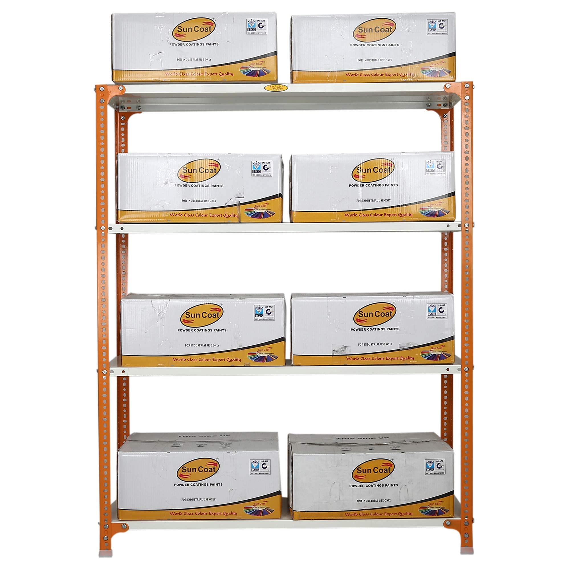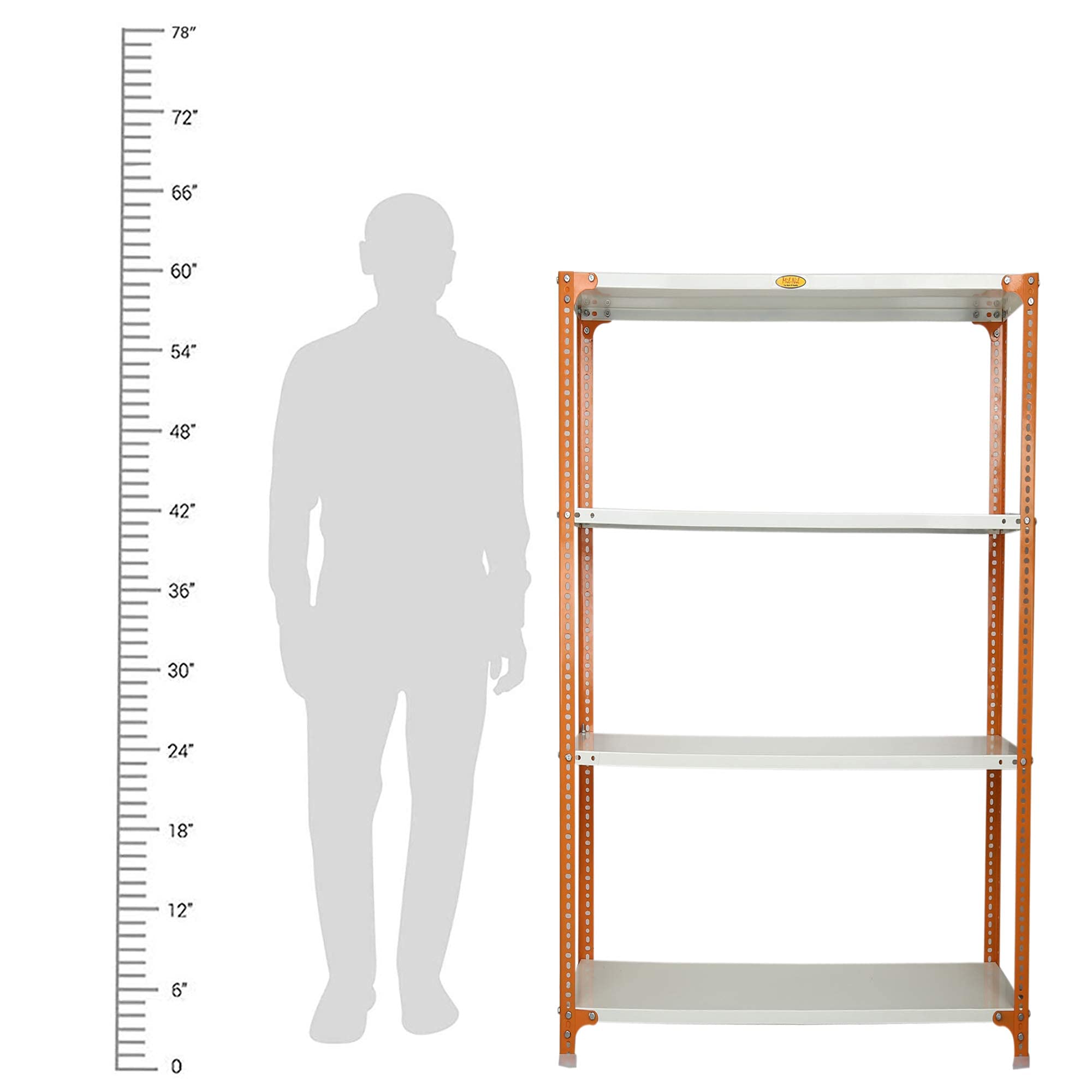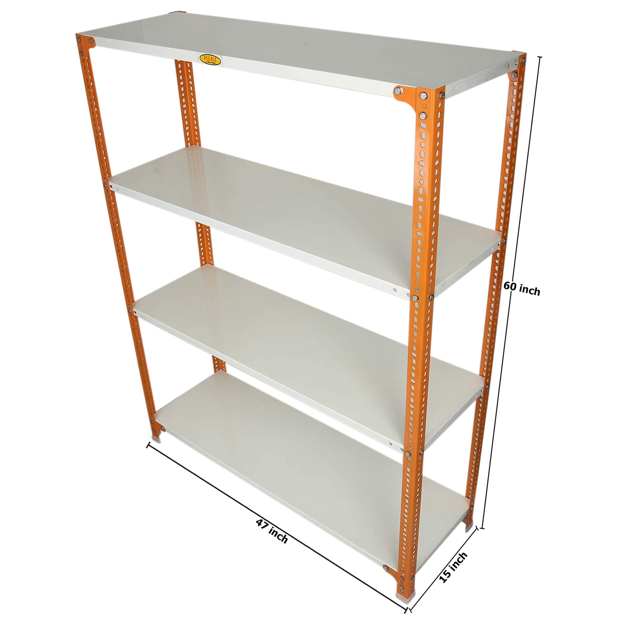 Item NameMil-Nil Prime CRC Sheet 4 Shelf Multipurpose Slotted Angle Rack, 60 x 47 x 15 Inch, 18 Gauge [(Orange-Ivory) Powder Coating] 14 Gauge Angles