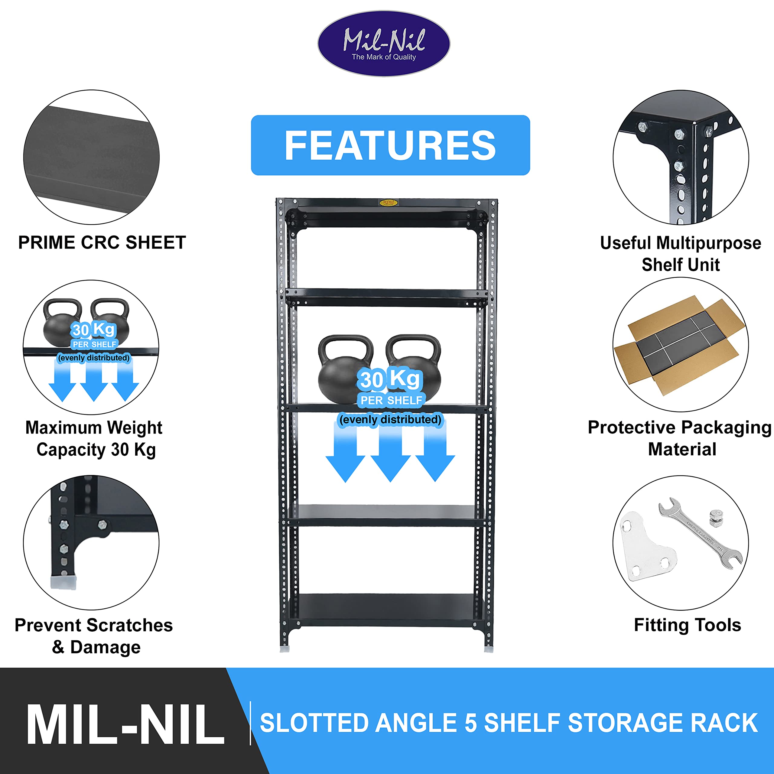 Item NameMil-Nil Prime CRC Sheet 5 Shelf 24 Gauge Multipurpose Slotted Angle Rack | Adjustable Shelf Hight for Home & Kitchen 18 Gauge Angle (48X36X9 inches, 11 Kg, Grey)