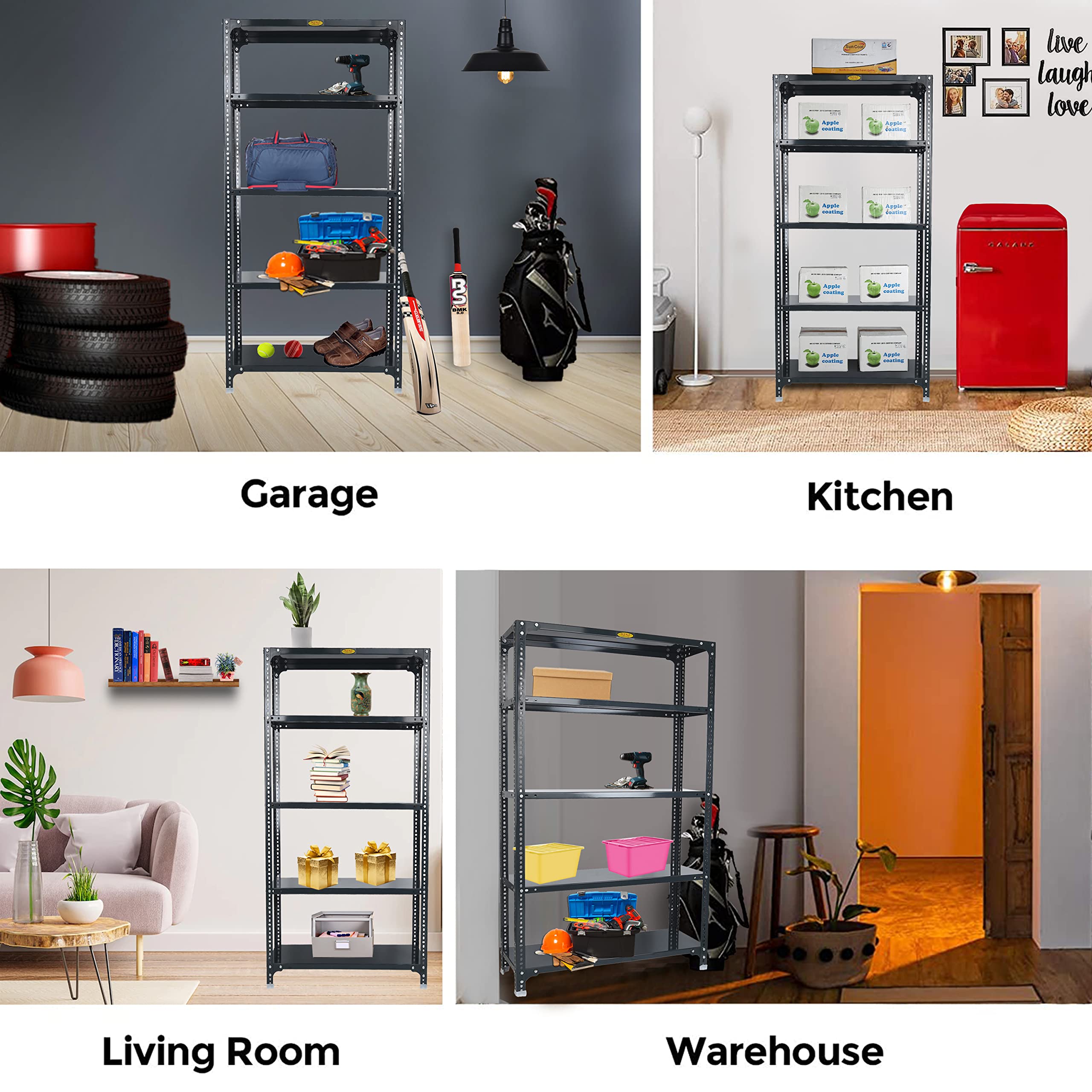 Bullet Point 4✔​​​​​​​ MATERIAL - PRIME CRC SHEET, Iron Slotted Angle, Free Protective Rubber Feet. Usage: It's a Multipurpose Storage rack that can be used as a kitchen rack, book rack, cloth rack, office rack, living room rack, Industries rack, etc.