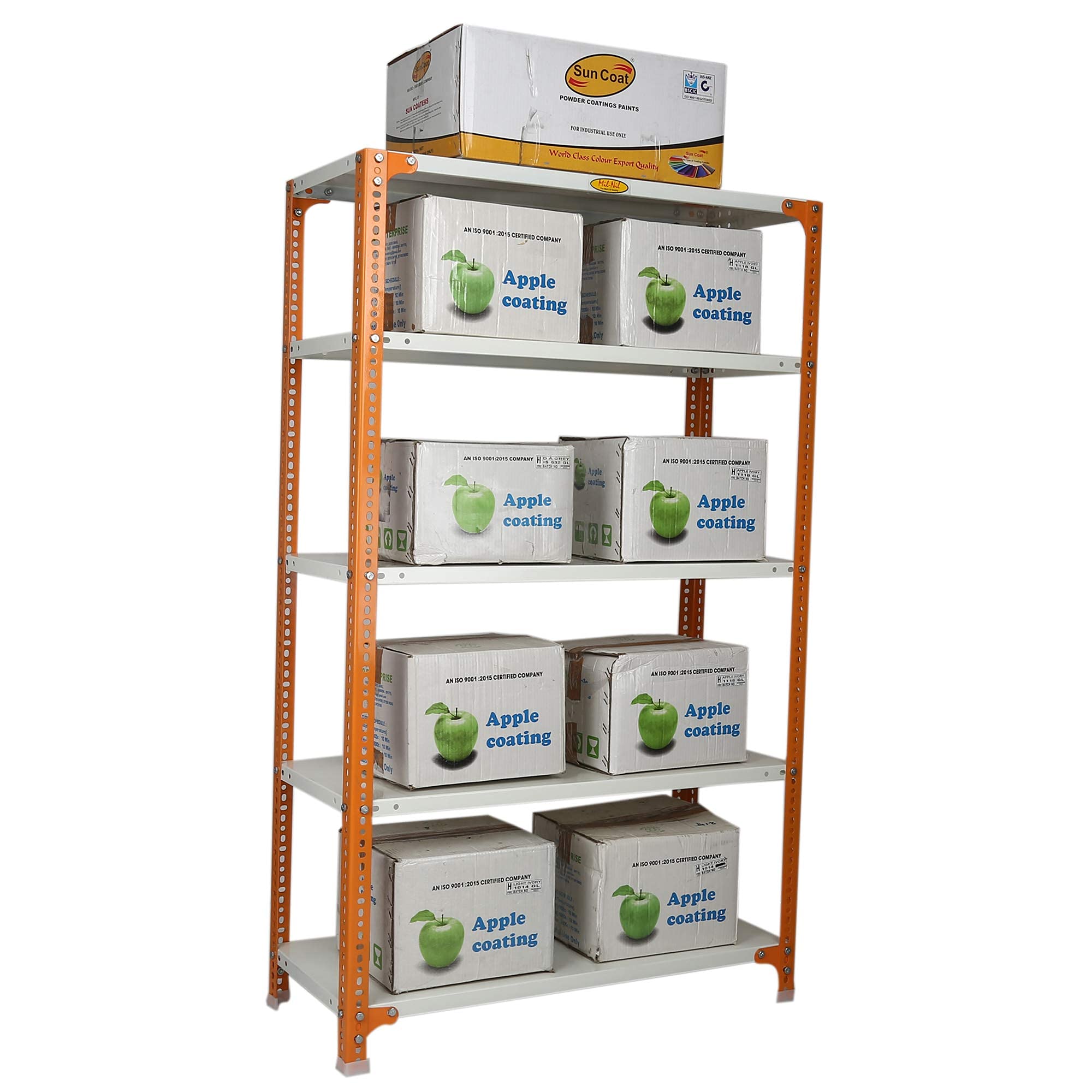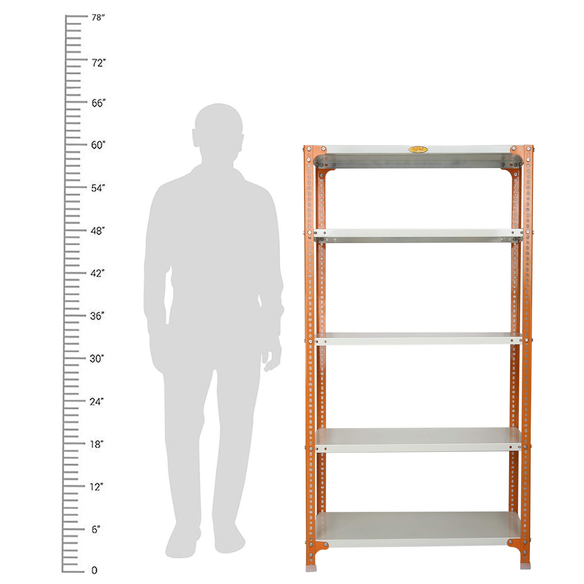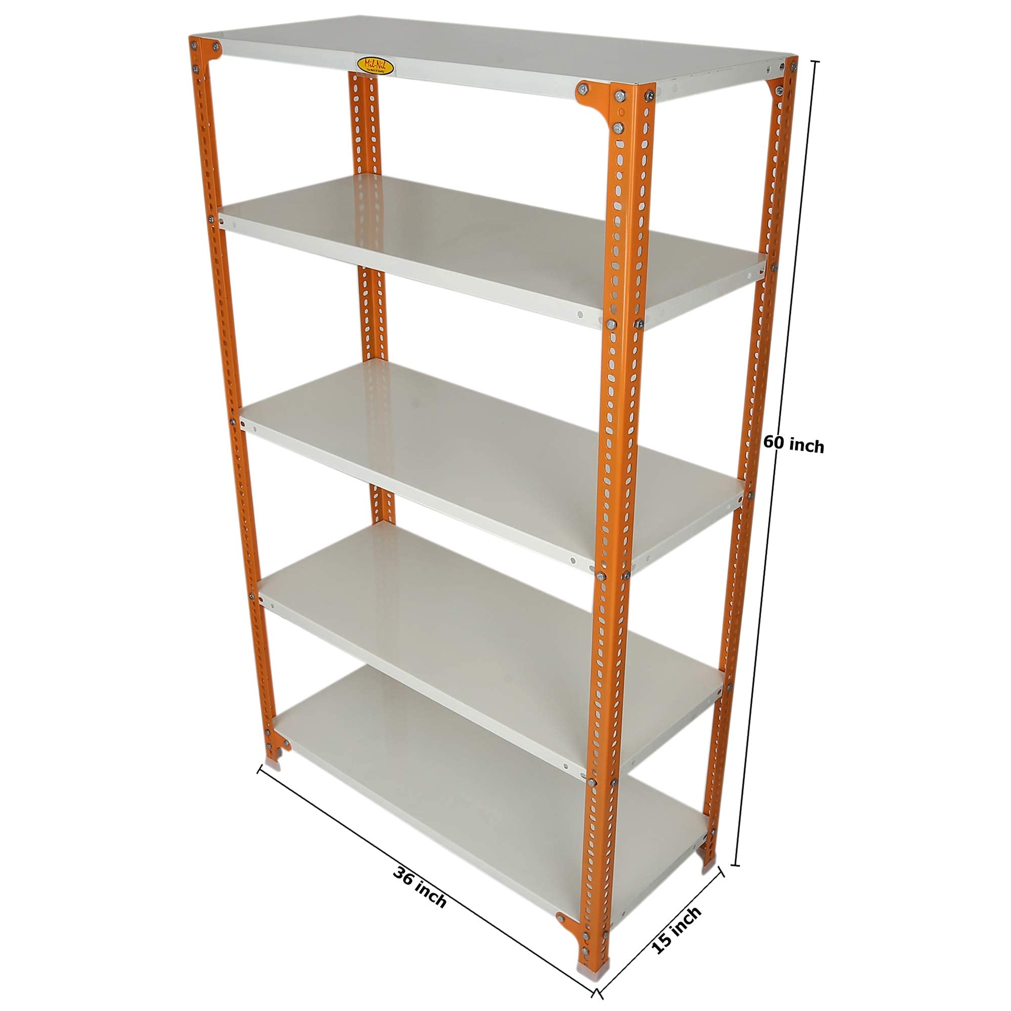 Item NameMil-Nil Prime CRC Sheet 5 Shelf Multipurpose Slotted Angle Rack, 60 x 36 x 15 Inch, 18 Gauge [(Orange-Ivory) Powder Coating] 14 Gauge Angles