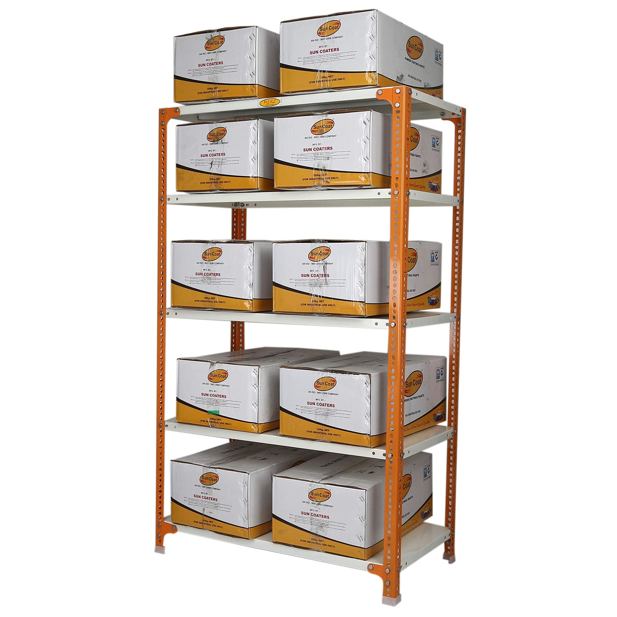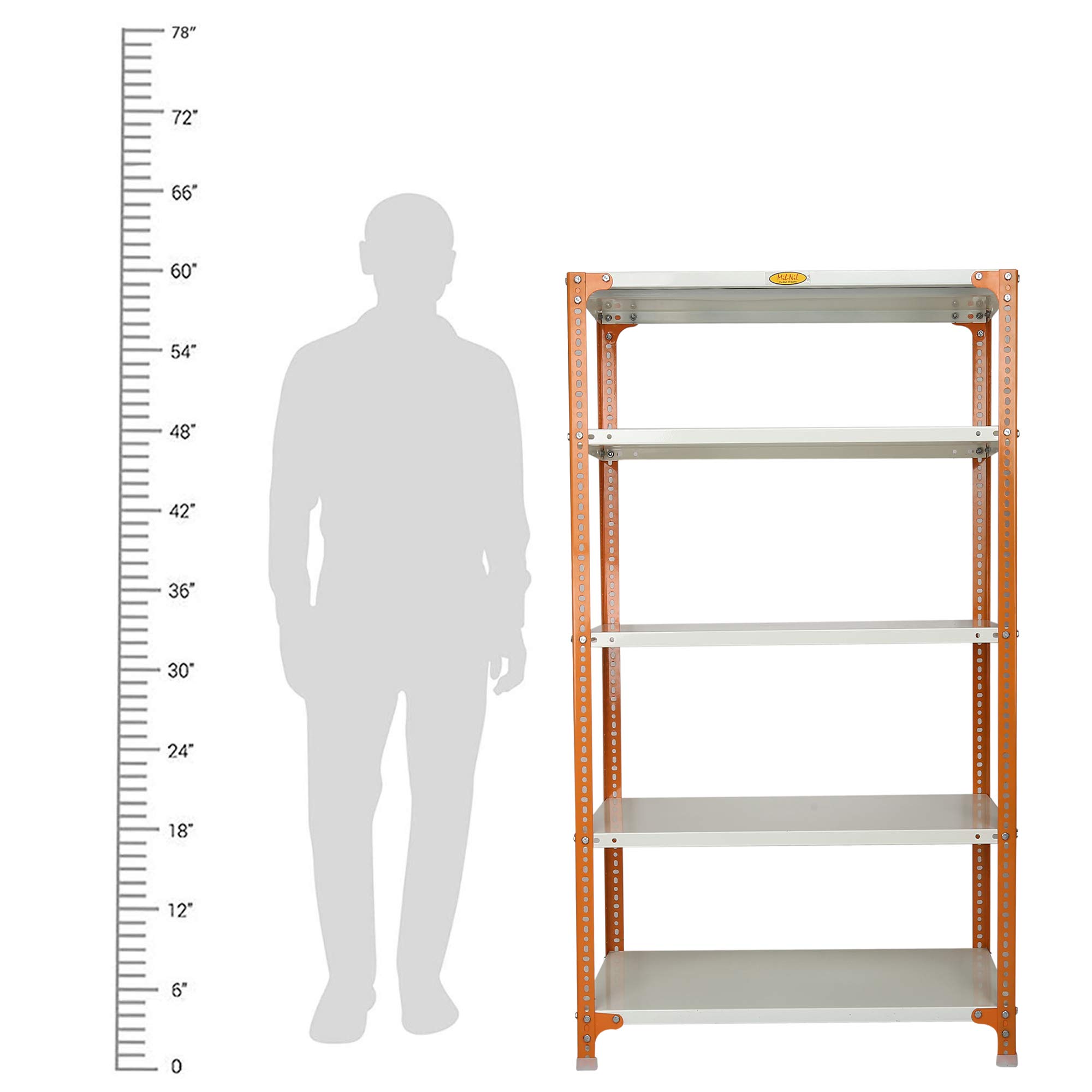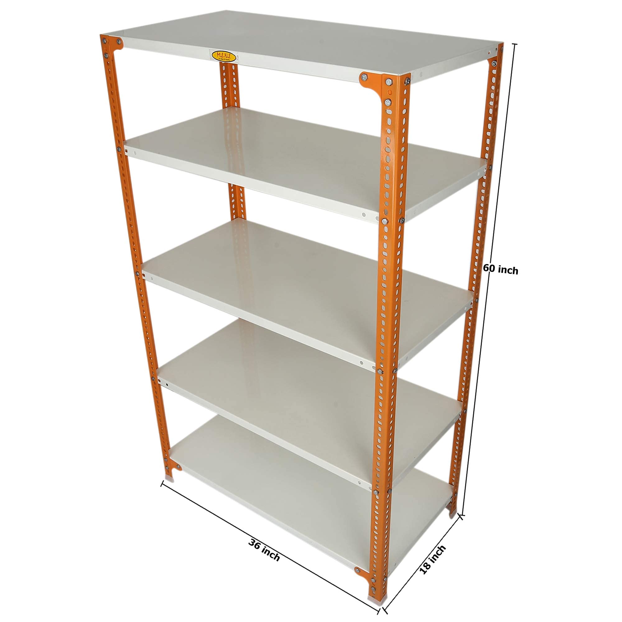 Item NameMil-Nil Prime CRC Sheet 5 Shelf Multipurpose Slotted Angle Rack, 60 x 36 x 18 Inch, 20 Gauge [(Orange-Ivory) Powder Coating] 14 Gauge Angles