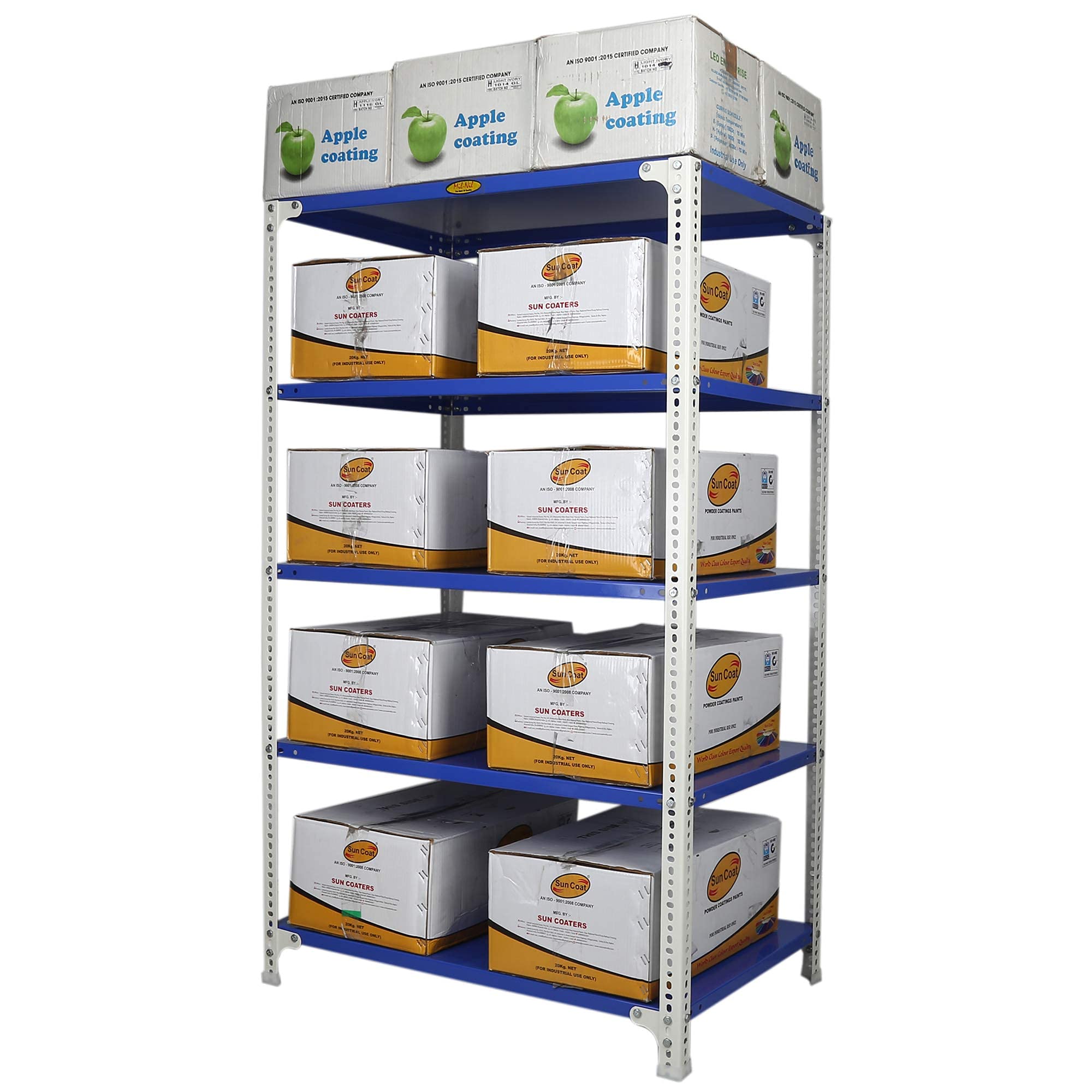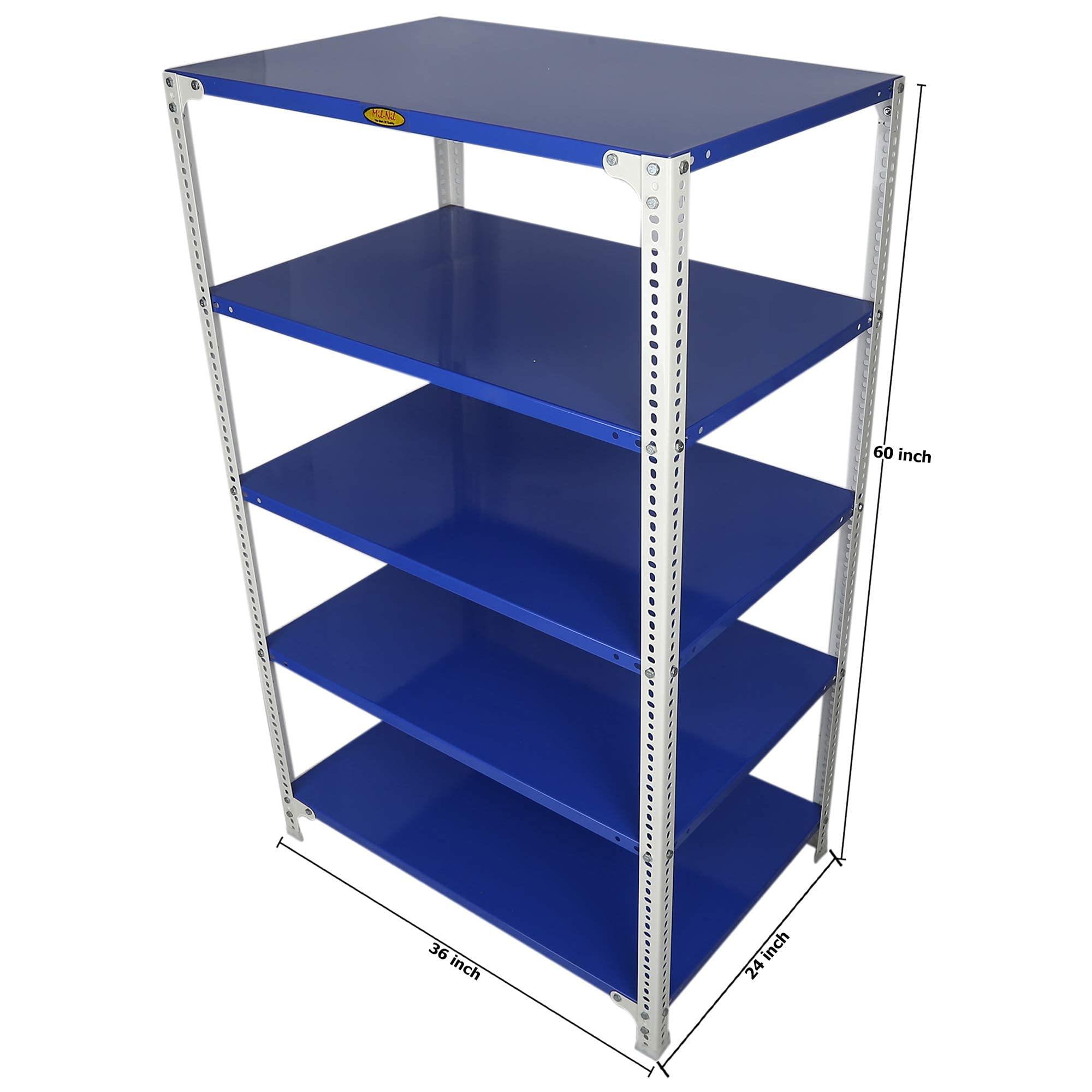 Item NameMil-Nil Prime CRC Sheet 5 Shelf Multipurpose Slotted Angle Rack, 60 x 36 x 24 Inch, 18 Gauge [(Blue-White) Powder Coating] 14 Gauge Angles