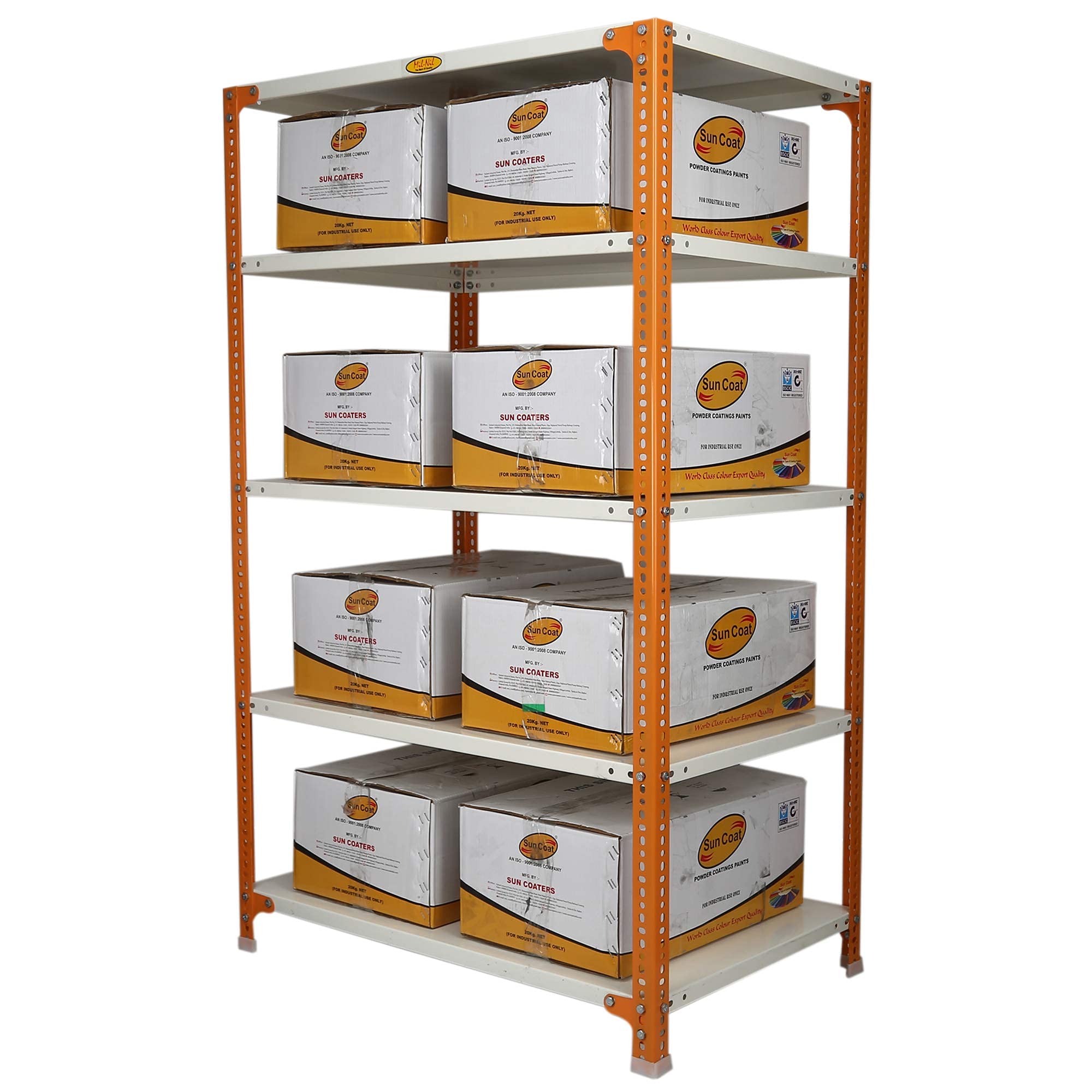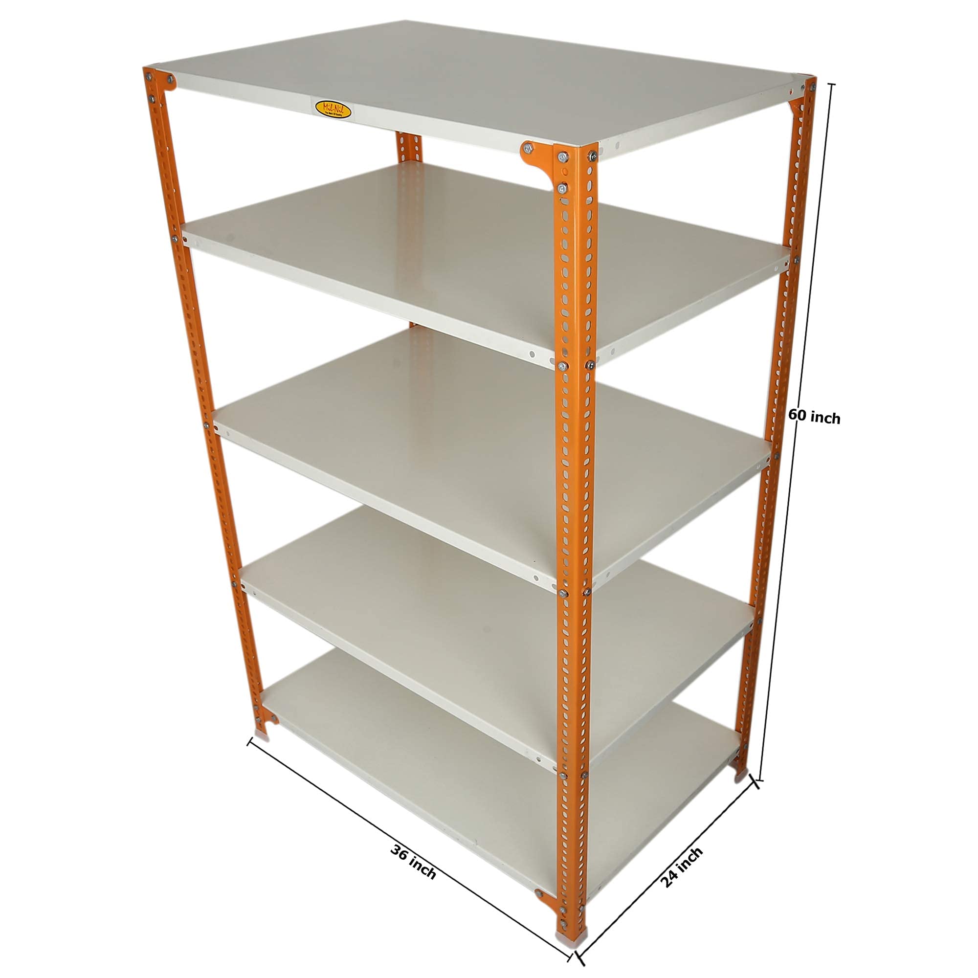Item NameMil-Nil Prime CRC Sheet 5 Shelf Multipurpose Slotted Angle Rack, 60 x 36 x 24 Inch, 20 Gauge [(Orange-Ivory) Powder Coating] 14 Gauge Angles