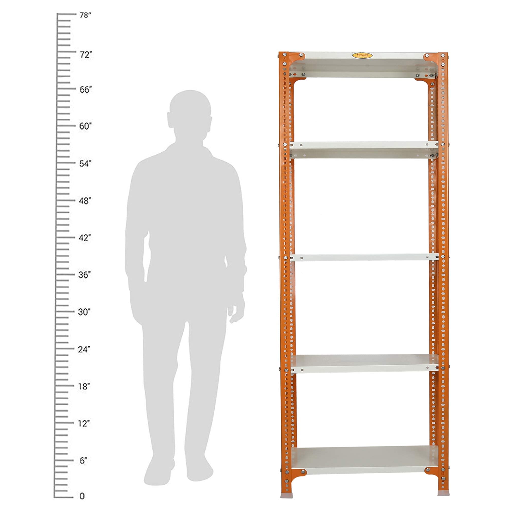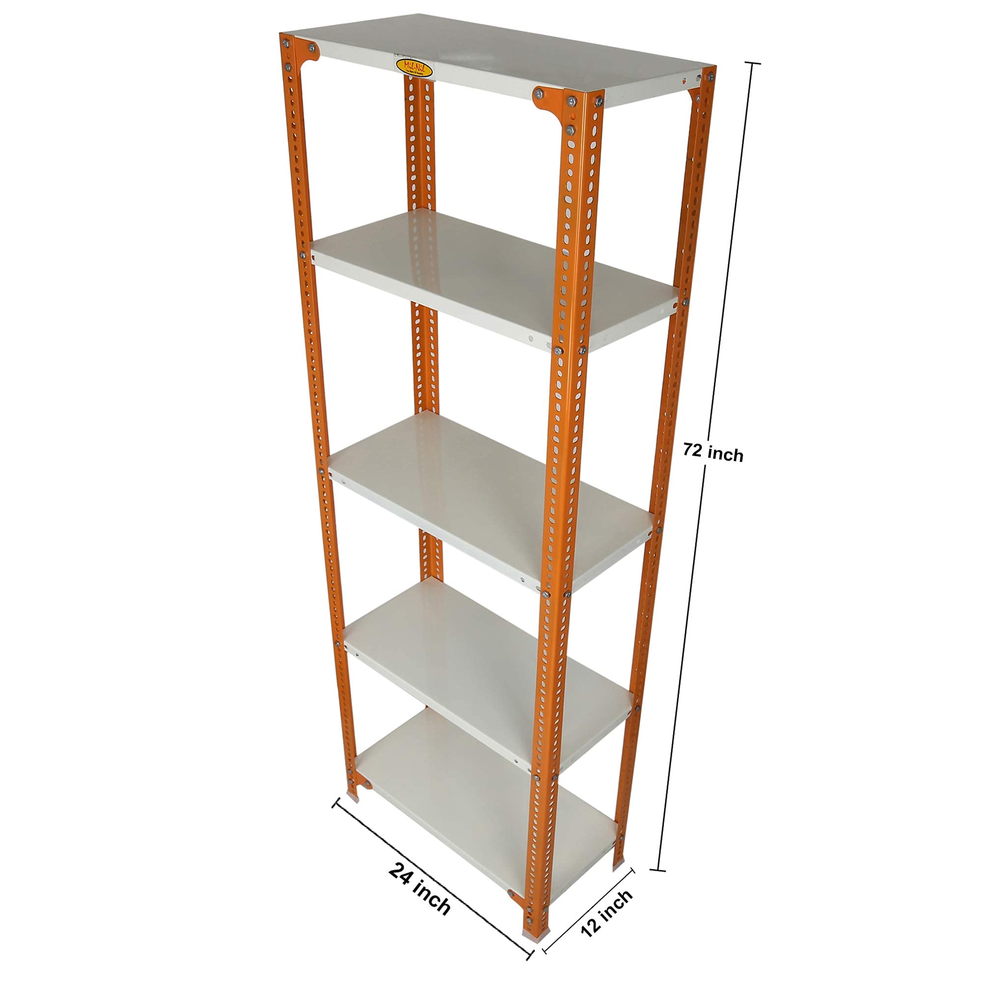 Item NameMil-Nil Prime CRC Sheet 5 Shelf Multipurpose Slotted Angle Rack, 72 x 24 x 12 Inch, 24 Gauge [(Orange-Ivory) Powder Coating] 16 Gauge Angles
