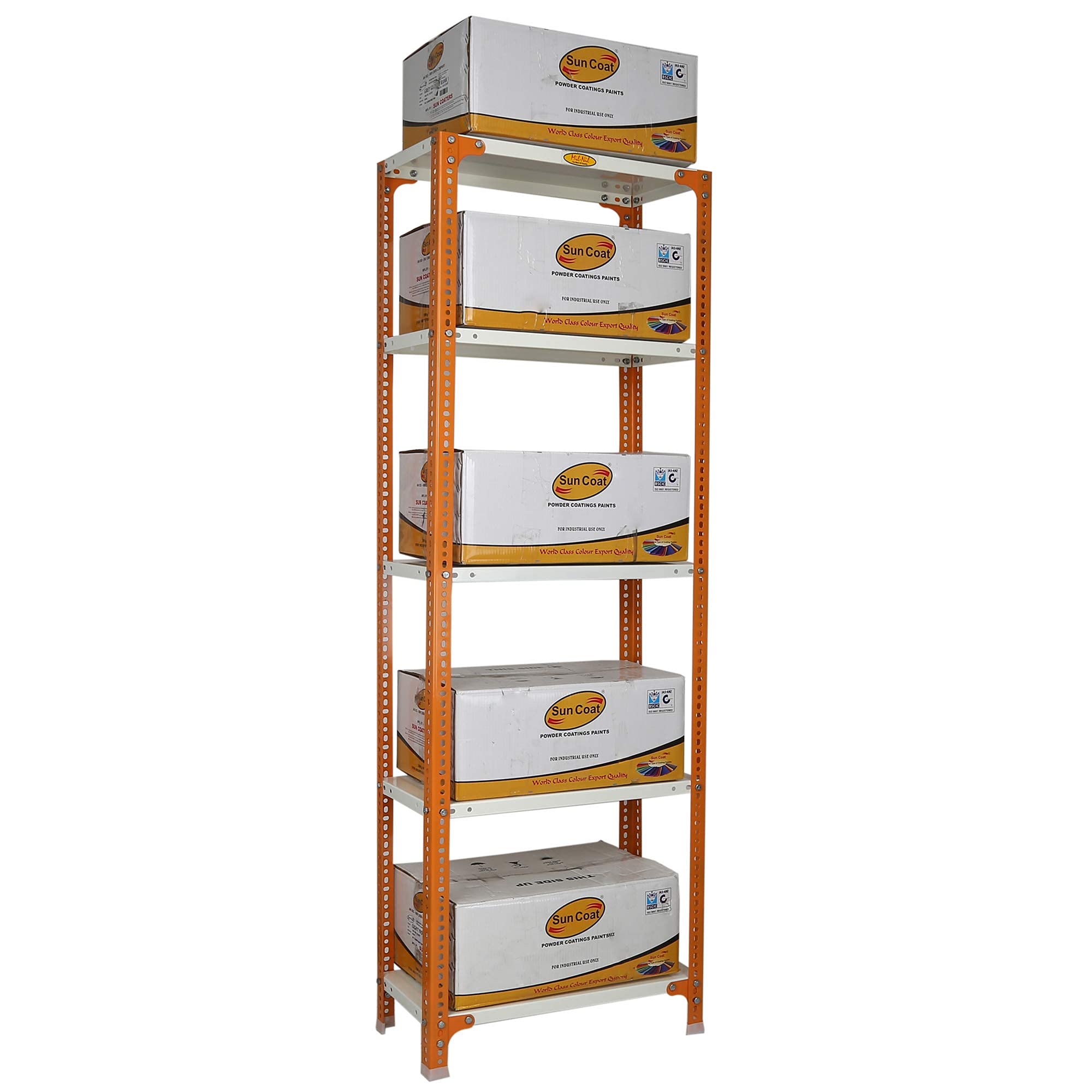 Bullet Point 4Product Weight: 13.5 KG, Product Dimension(in inch): 72 x 24 x 12, Weight capacity per shelf: 50 KG, Color: Orange-Ivory (Powder Coating)
