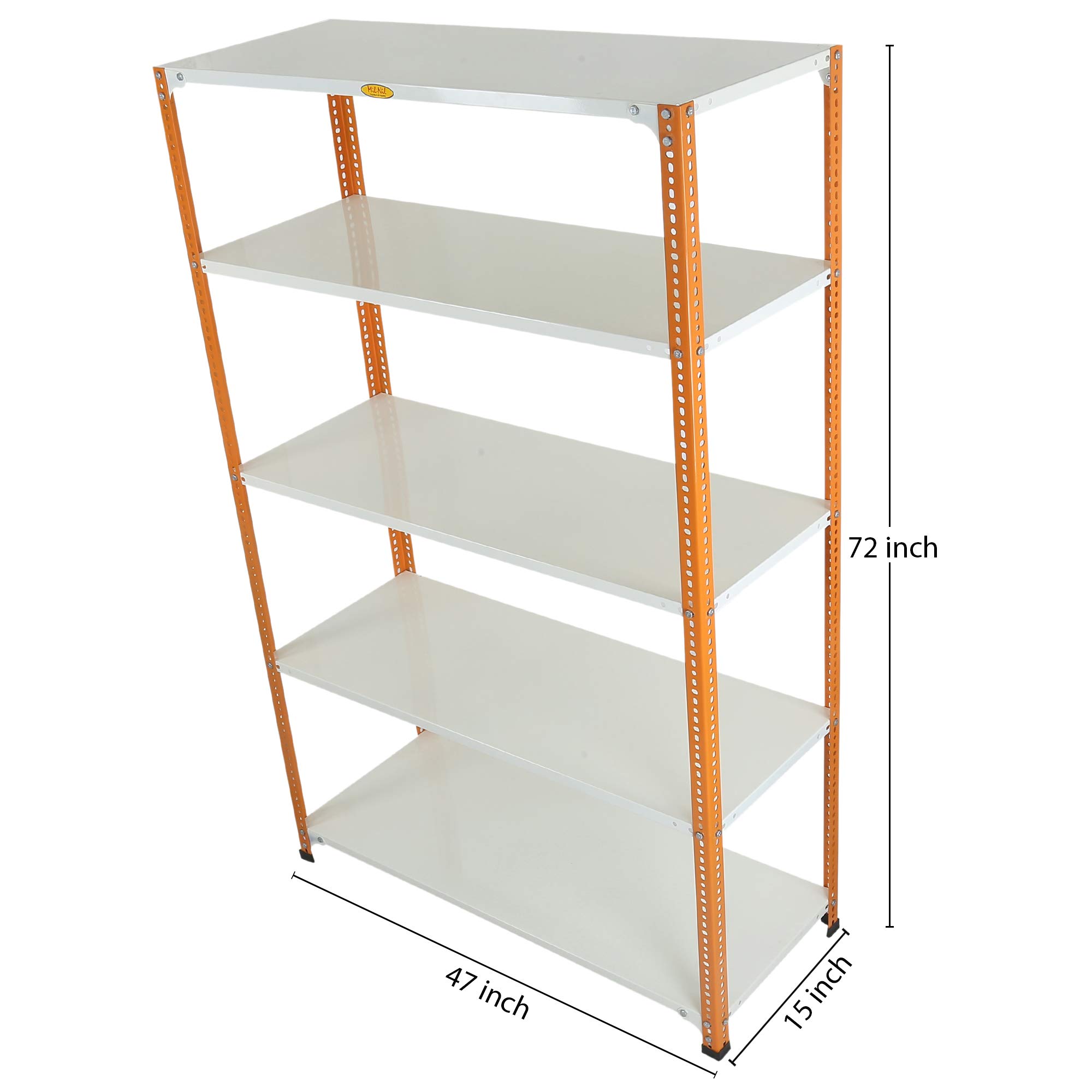Item NameMil-Nil Prime CRC Sheet 5 Shelf Multipurpose Slotted Angle Rack, 72 x 47 x 15 Inch, 18 Gauge (Orange/Ivory) Powder Coated 14 Gauge Angles
