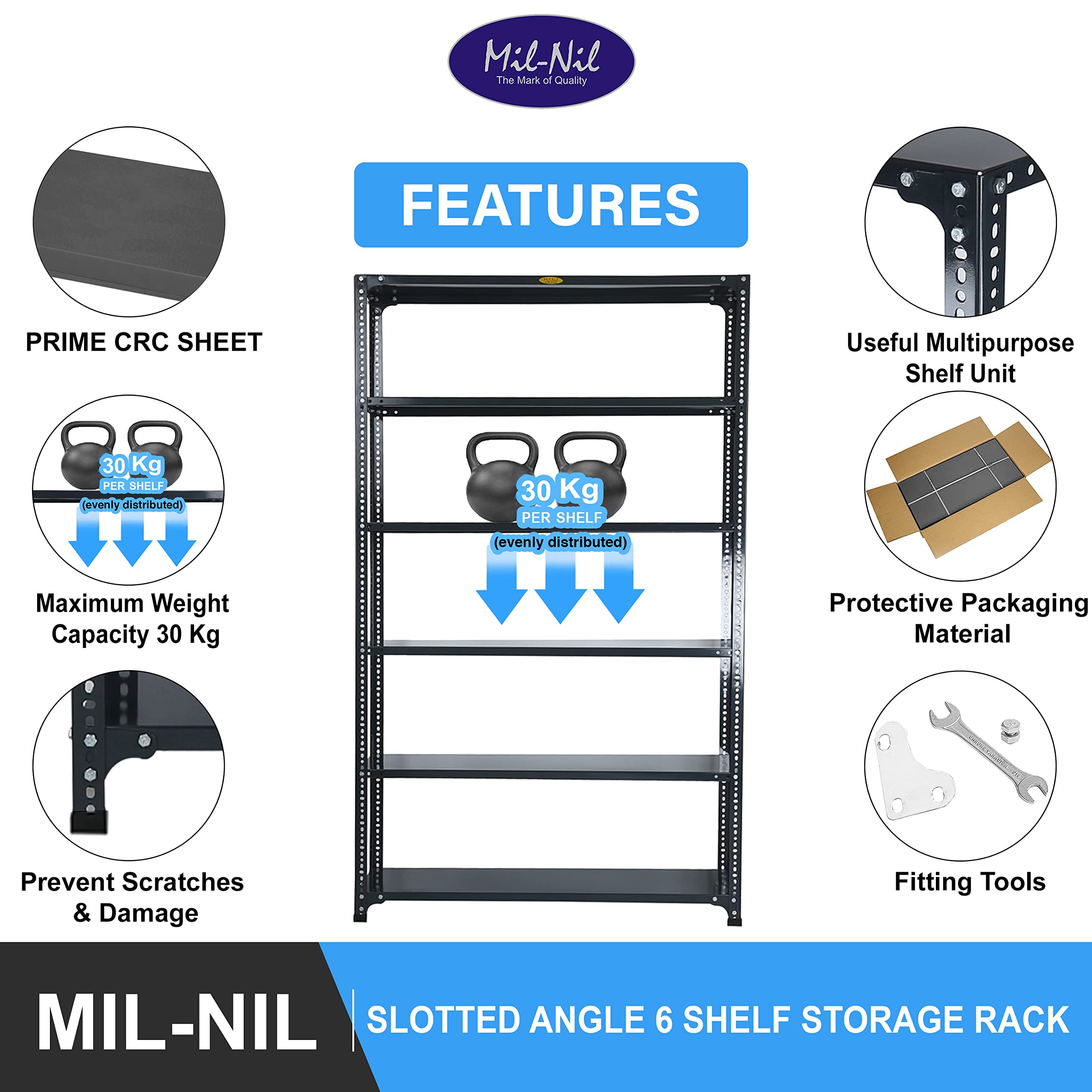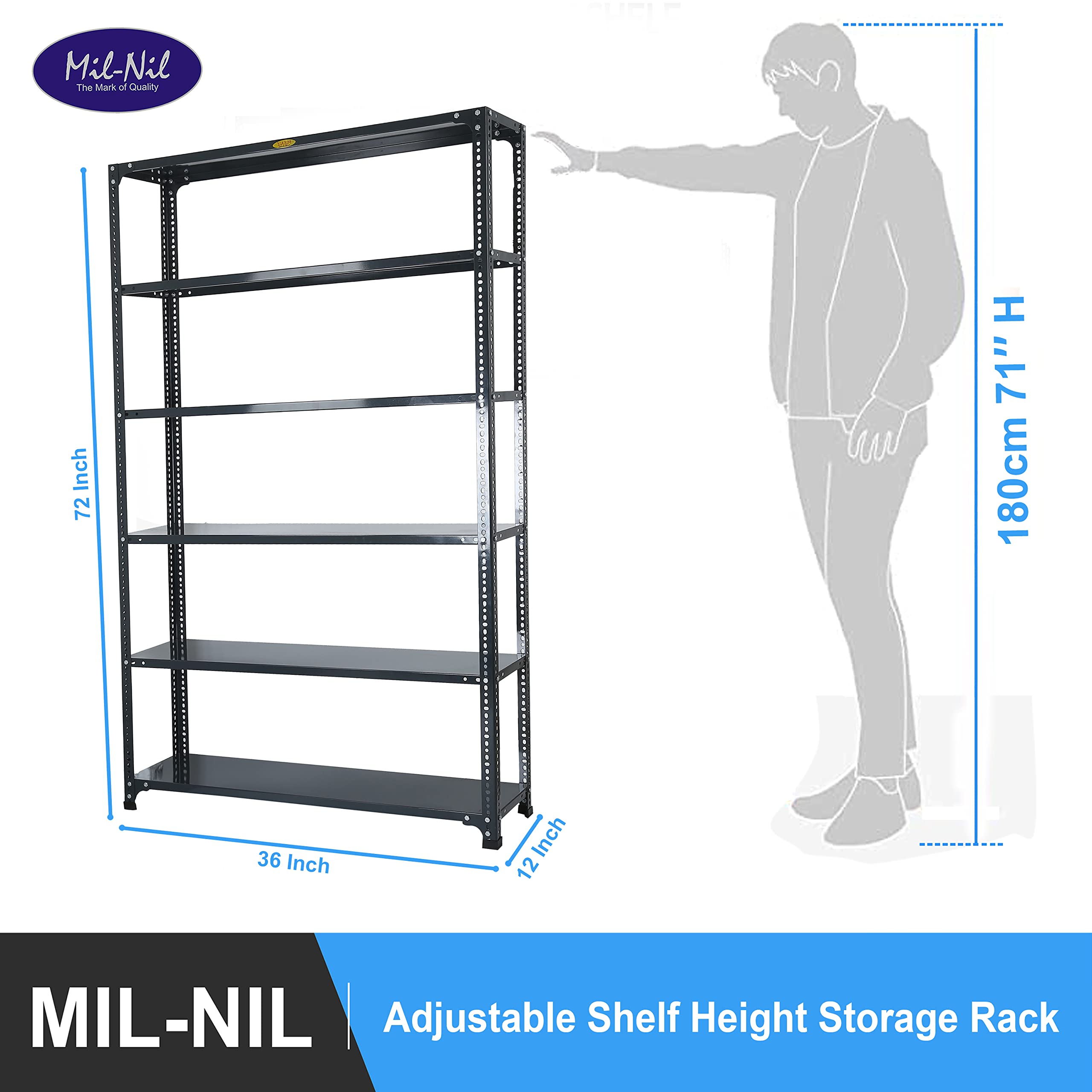Item NameMil-Nil Prime CRC Sheet 6 Shelf 24 Gauge Multipurpose Slotted Angle Rack | Adjustable Shelf Hight for Home & Kitchen 18 Gauge Angle (72X36X12 inches, 16.1 Kg, Grey)