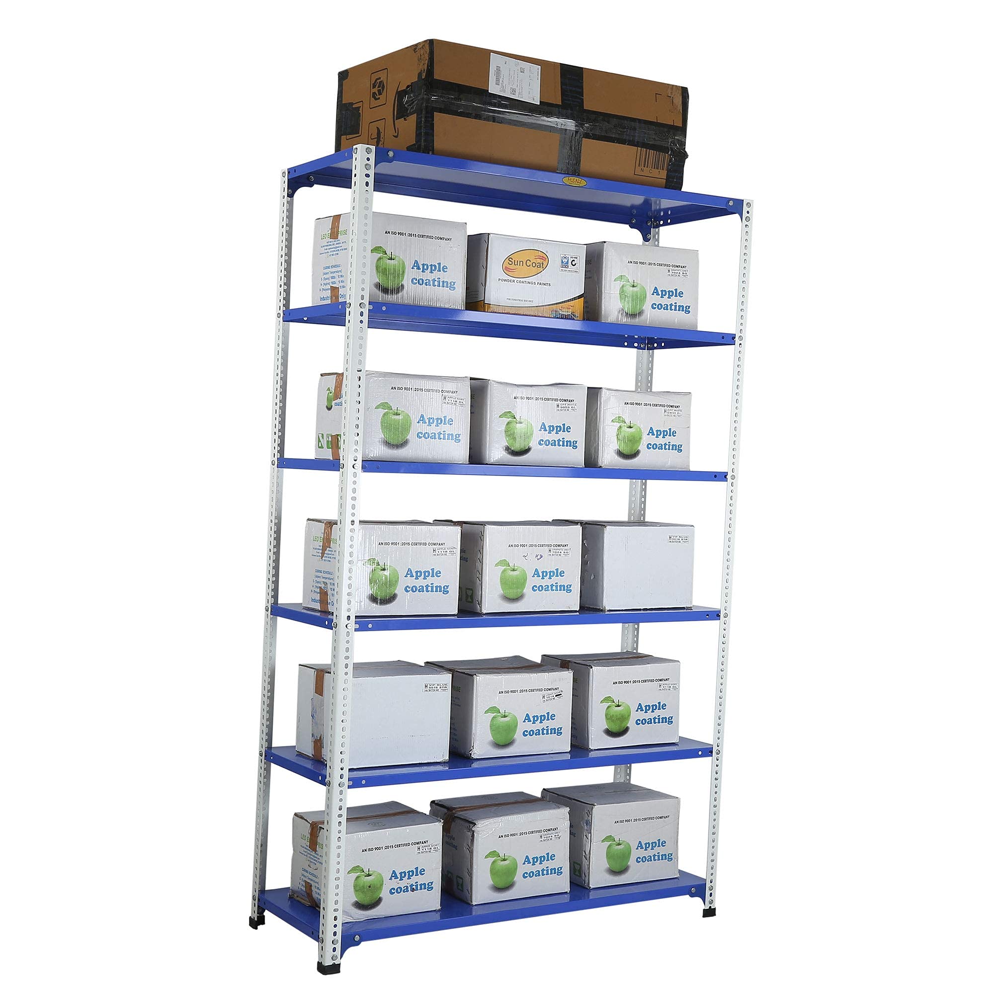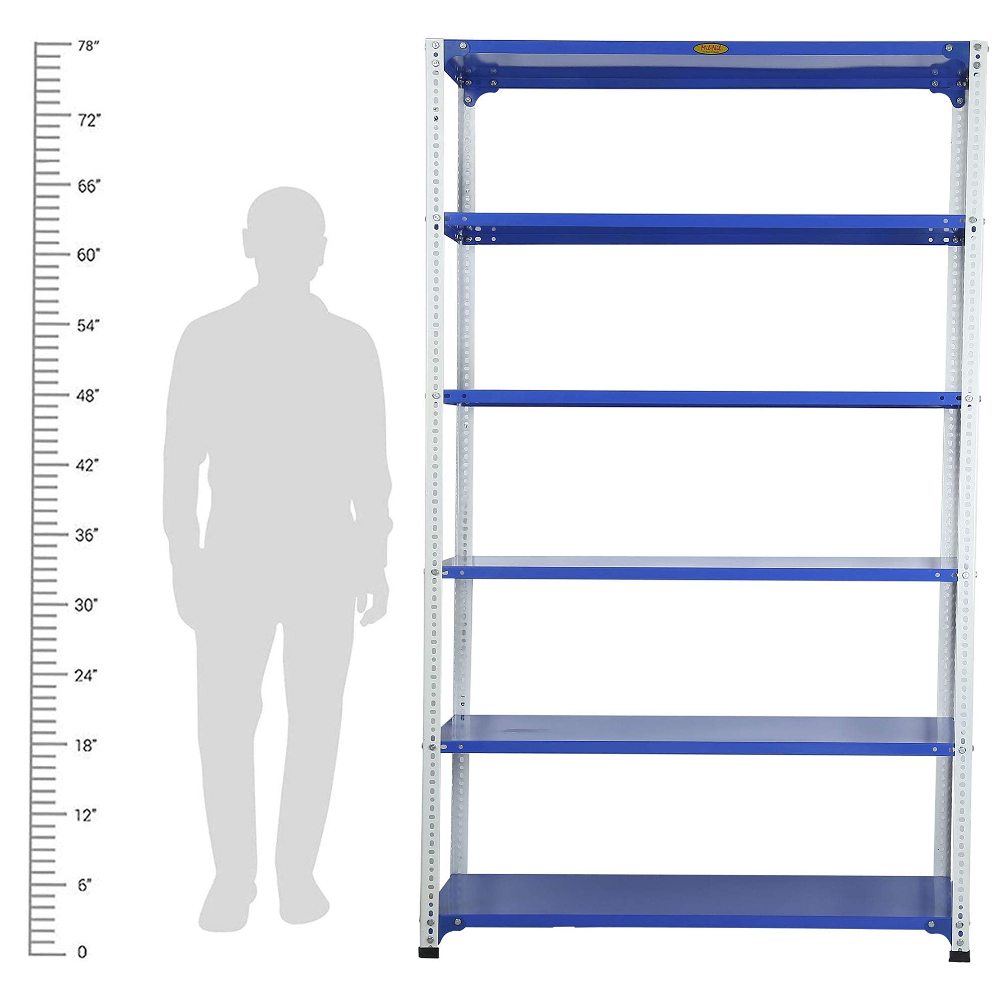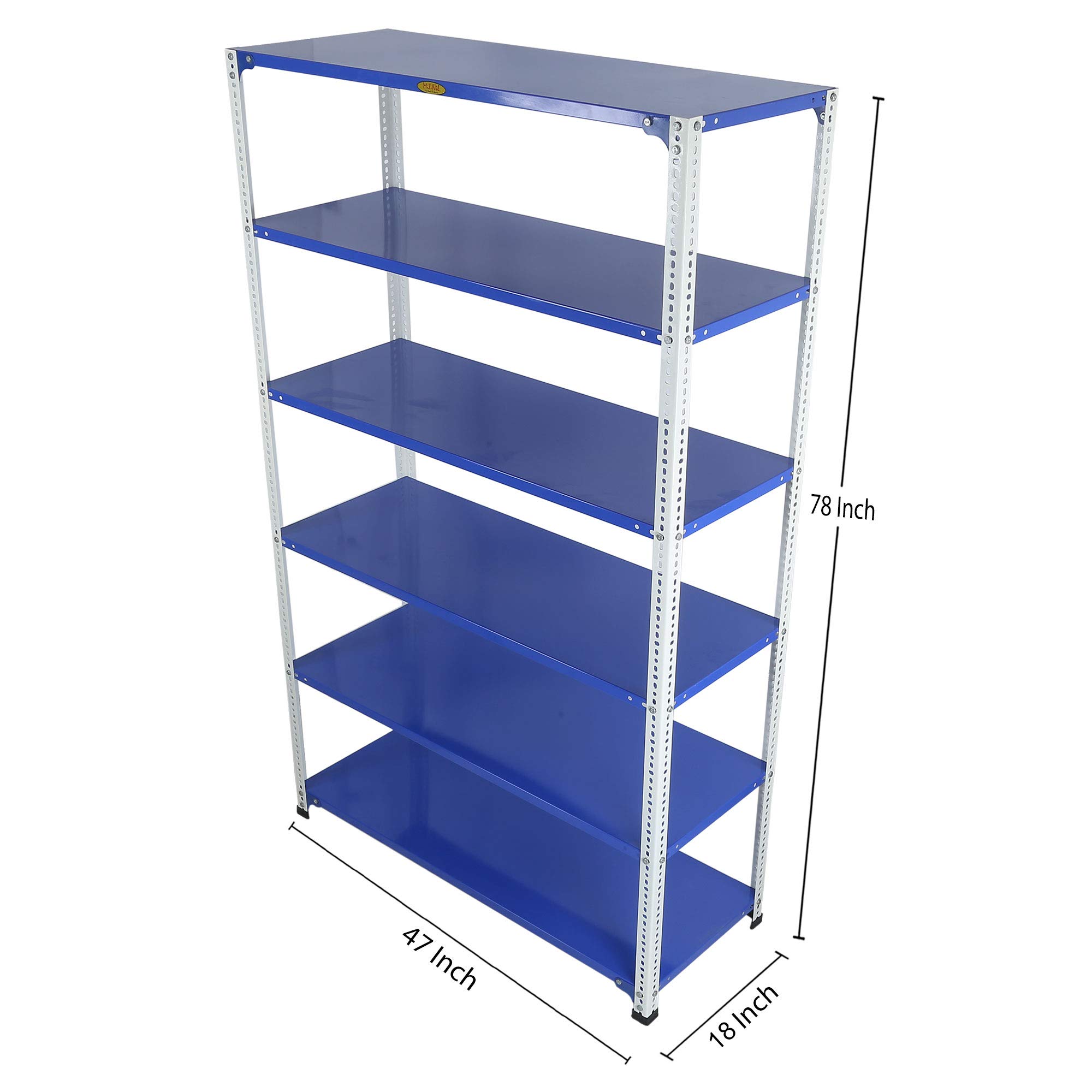 Item NameMil-Nil Prime CRC Sheet 6 Shelf Multipurpose Slotted Angle Rack, 78 x 47 x 18 Inch, 18 Gauge (Blue-White) Powder Coated 14 Gauge Angles