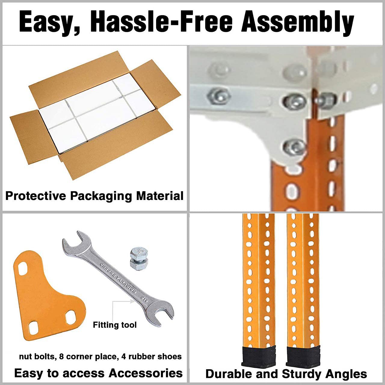 Package Includes: 1 Storage Rack, 64 Nut Bolts, 4 Rubber Shoes, 8 Corner Place, and 2 Spanner will be delivered to the customer in one packet.