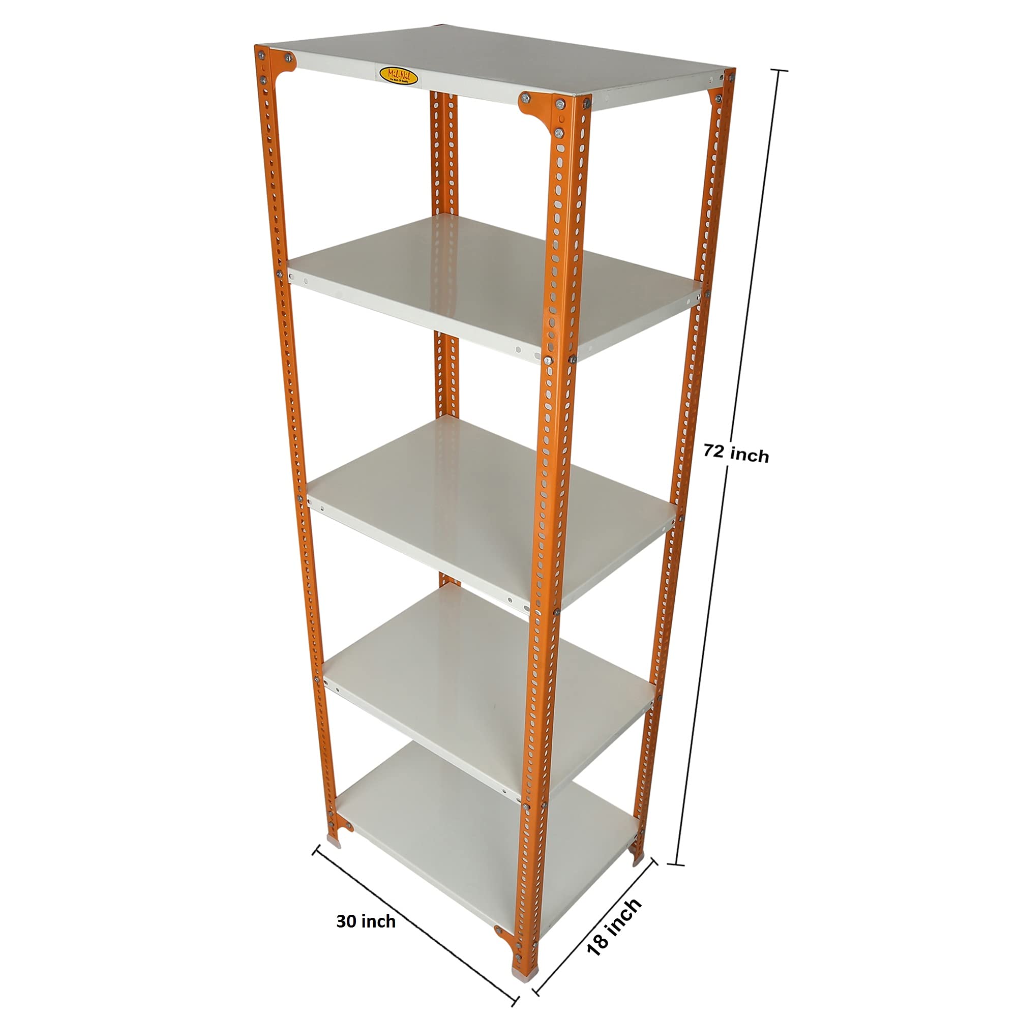 Item NameMil-Nil Prime CRC Sheet 72X30X18 Inch Multipurpose Storage, Adjustable Shelf, Slotted Angle Rack with 5 Shelves 24 Gauge_Orange/Ivory 16 Gauge Angles